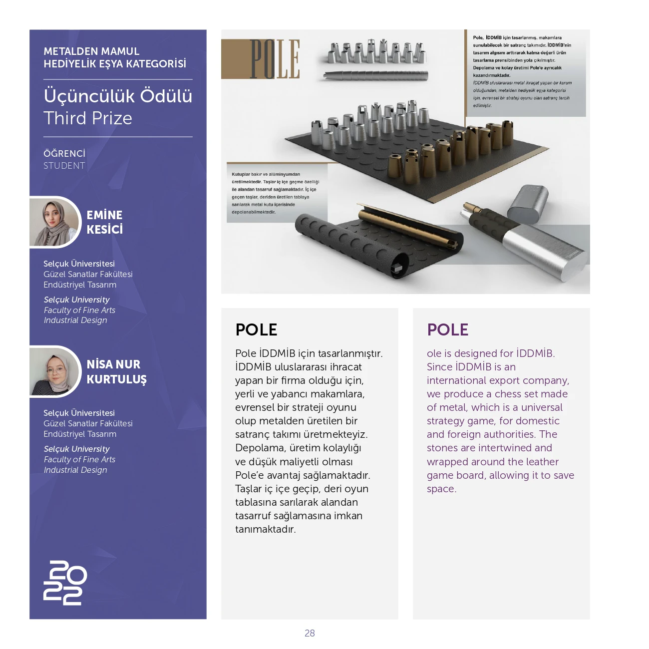 Türkiye İhracatçılar Meclisi (TİM), T.C. Ticaret Bakanlığı desteği ile İstanbul Maden ve Metaller İhracatçı Birlikleri’ nin geleneksel olarak düzenlediği İMMİB 2022 Endüstriyel Tasarım Yarışması Ödül Töreni Ülkemizde yaşanan deprem felaketi nedeniyle gecikmeli olarak 23 Ağustos 2023 de Yapıldı. Katma değeri yüksek ürünlerin geliştirilmesi, endüstriyel tasarım etkinliklerinin yaygınlaştırılması ve özendirilmesi, ihracata yönelik rekabet gücünün arttırılması amacıyla 2 ayrı temada düzenlenen yarışmada öğrenci kategorisinde toplam 8 ödül verildi. Bu ödüllerden 7 sini Selçuk Üniversitesi Güzel Sanatlar Fakültesi Endüstriyel Tasarım Bölümü öğrencilerimiz aldı.