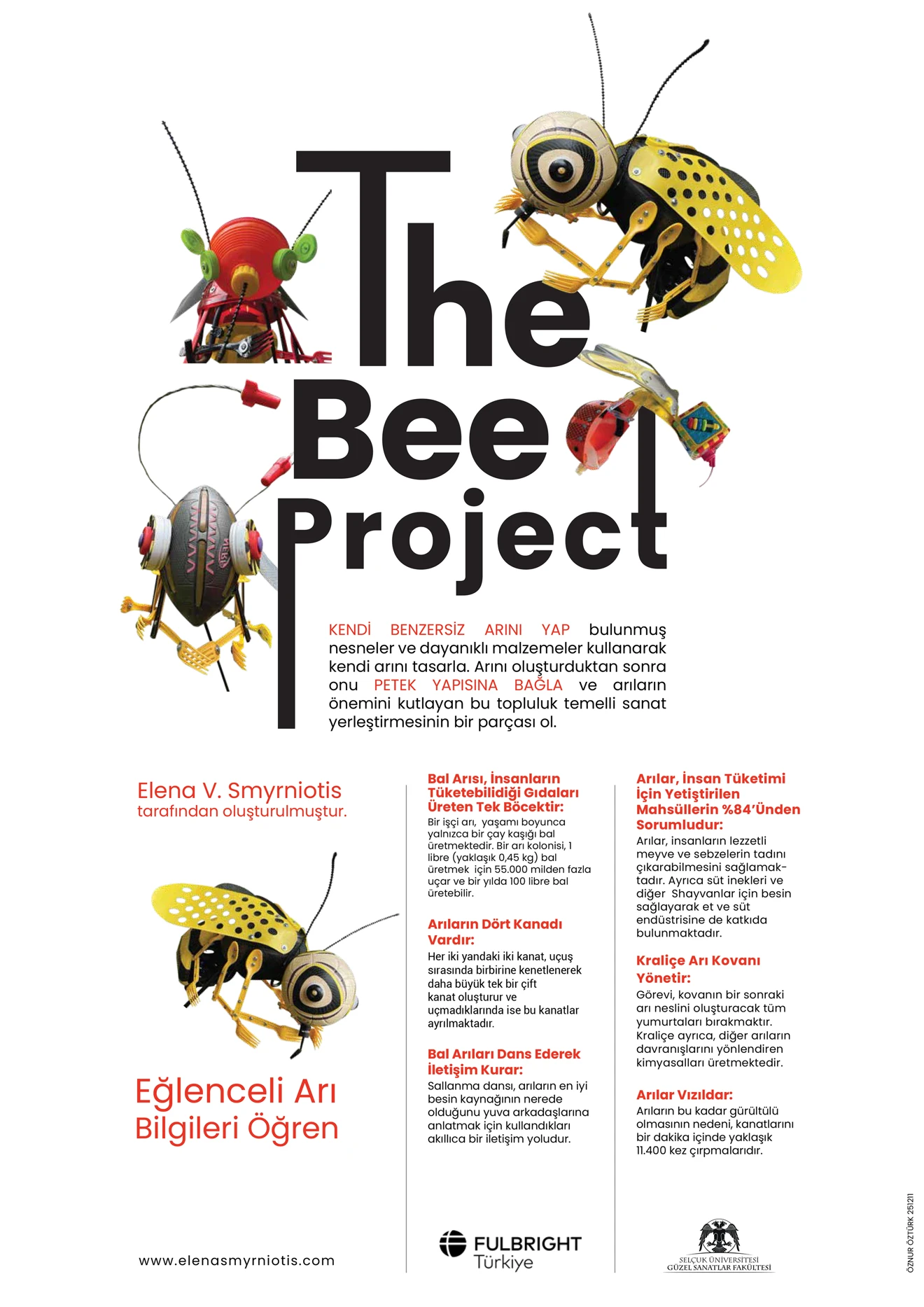 Açılış konuşmasının ardından proje yürütücüsü Elena Smyrniotis, projenin içeriği ve yürütülme sürecine ilişkin değerlendirmelerde bulundu. The Bee Project’in Amerika Birleşik Devletleri’nde geliştirilen, farklı ülkelerde temsil edilen ve geniş kitleler tarafından ilgi gören bir proje olduğunu belirten Smyrniotis, projenin temel yaklaşımını şu sözlerle aktardı: “Bu proje; iklim değişikliği ve polen dağılımı açısından ekosistemde kritik bir rol üstlenen canlılar, özellikle arılar üzerine odaklanıyor. Aynı zamanda sürdürülebilir bir proje. Üretim sürecinde geri dönüştürülmüş malzemeler kullanıyoruz. Sergide yer alan tüm heykeller, bu stüdyoda öğrenciler ve farklı katılımcıların katkılarıyla üretildi. Bu proje toplumsal bir projedir, sanata ilgi duyan ya da duymayan herkesin erişimine açıktır. Ziyaretçiler QR kodlar aracılığıyla projeyi dijital ortamda da takip edebilir, üretim süreçlerine ilişkin bilgilere ulaşabilir. Bu projeyi Selçuk Üniversitesinde hayata geçirmiş olmaktan büyük mutluluk duyuyorum.”