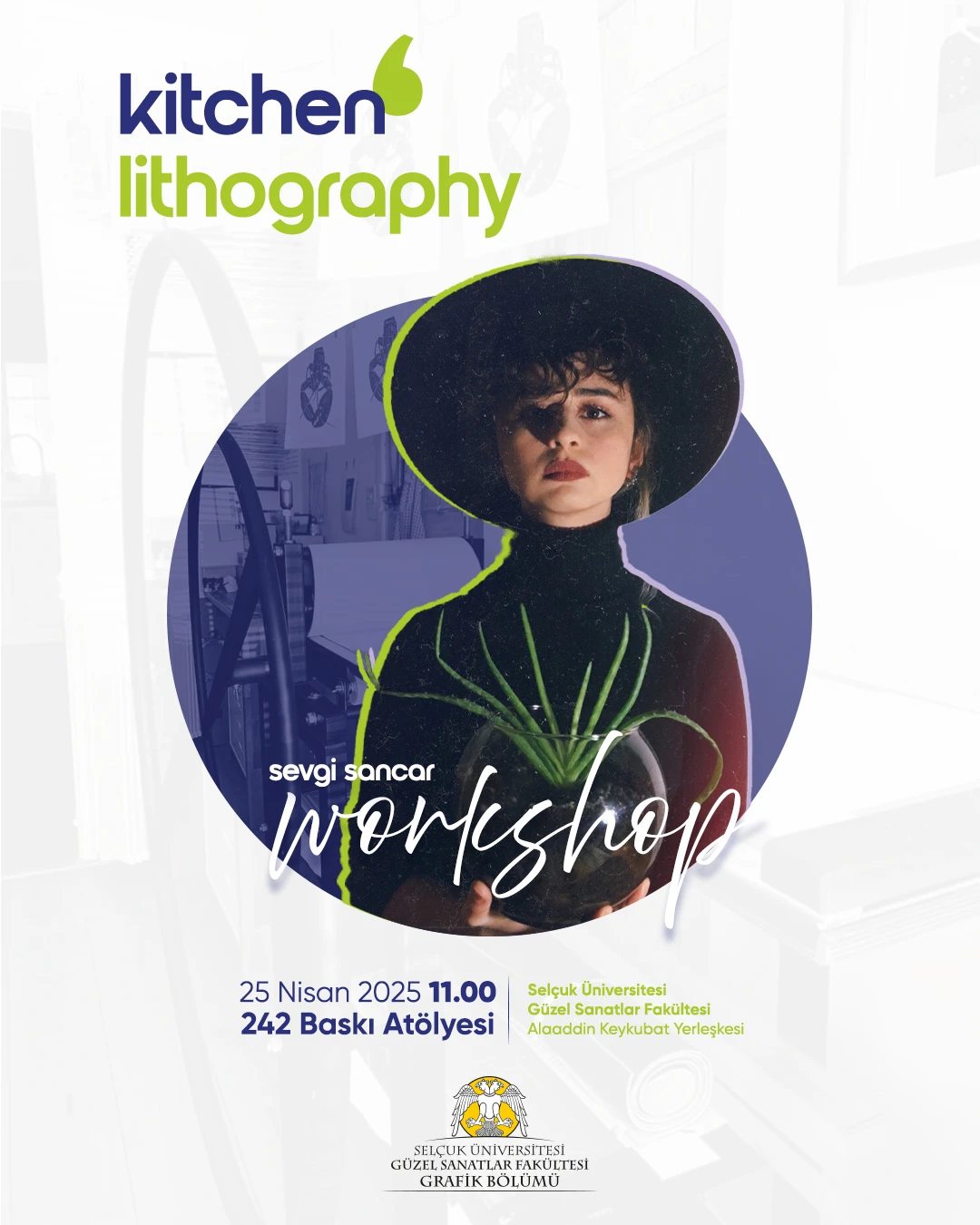 25 Nisan 2025 tarihinde, Selçuk Üniversitesi Güzel Sanatlar Fakültesi Grafik Bölümü tarafından düzenlenen "Kitchen Lithography" etkinliği, Prof. Dr. Birsen Limon’un eşliğinde yürütülmüştür. Gerçekleştirilen bu etkinlikte, Üniversitemizin Grafik Bölümünden mezun olmuş ve şu anda yüksek lisans eğitimine devam eden Sevgi Sancar, bir workshop çalışması gerçekleştirilmiştir.