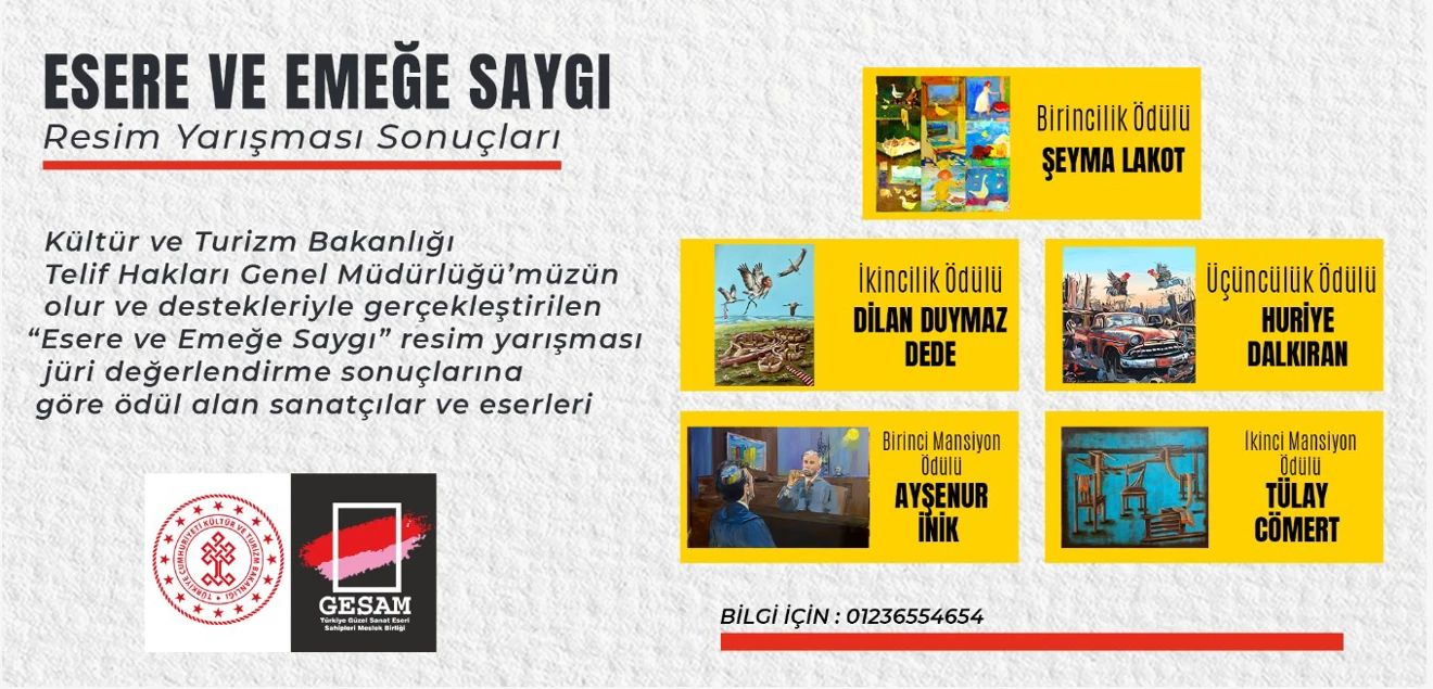 Kültür ve Turizm Bakanlığı ile Telif Hakları Genel Müdürlüğü’nün destek ve olurlarıyla GESAM- Türkiye Güzel Sanat Eseri Sahipleri Meslek Birliği tarafından düzenlenen, 06 Ocak 2025 tarihine kadar son müracaatların kabul edildiği “Esere ve Emeğe Saygı Resim Yarışması” sonuçları açıklandı. Lisans ve Lisansüstü öğrencilere açık olan yarışmada 3’ü derece, 2’si mansiyon olmak üzere toplam 5 adet ödül verildi.