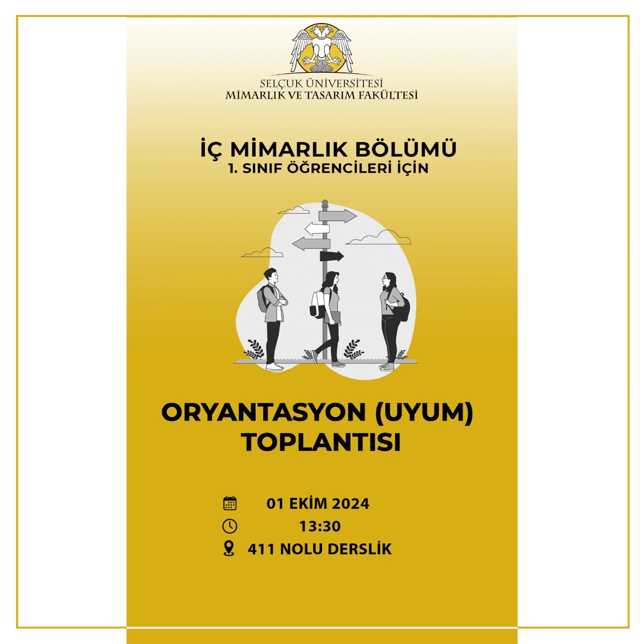 Duyurular 1. Sınıf Öğrencileri İçin Oryantasyon (Uyum) Toplantısı 30 Eylül 2024 İç Mimarlık Medya Paylaş: