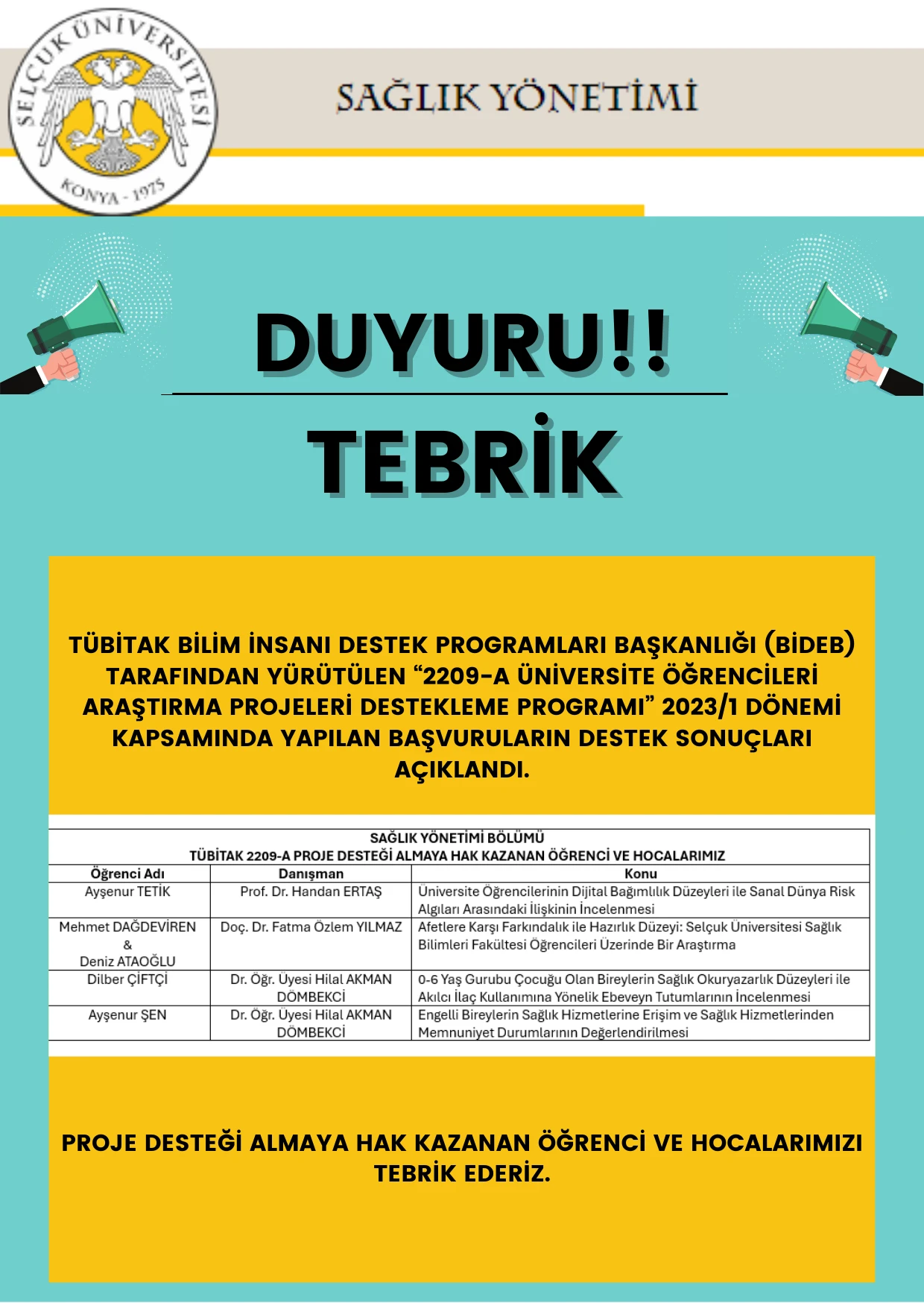Duyurular TÜBİTAK-2209-A ÜNİVERSİTE ÖĞRENCİLERİ ARAŞTIRMA PROJELERİ DESTEĞİ 22 Mart 2024 Sağlık Yönetimi Medya Paylaş: