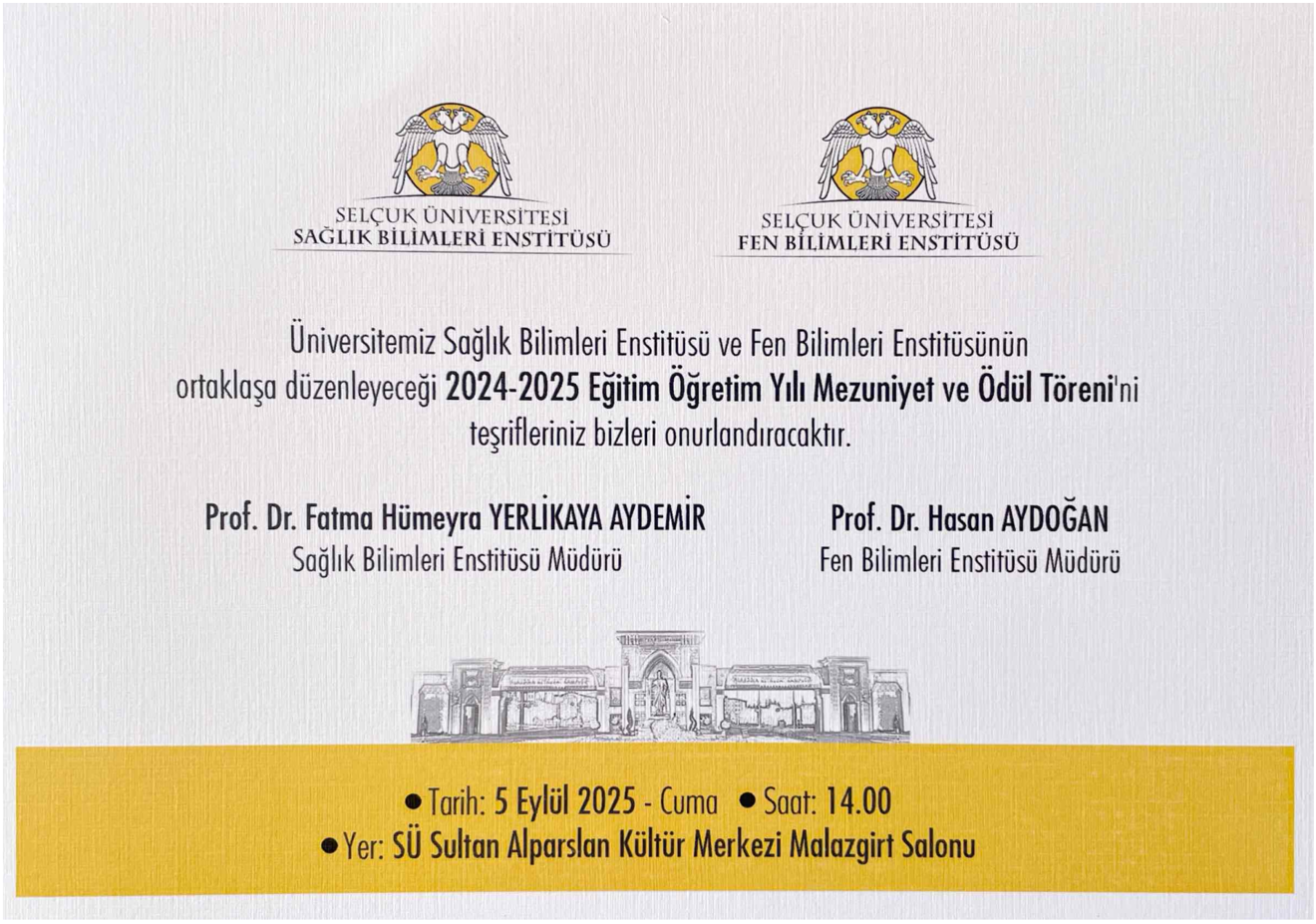 Duyurular Mezuniyet Programı Daveti - 2024-2025 Mezuniyet Töreni 03 Eylül 2025 Fen Bilimleri Enstitüsü Medya Paylaş: