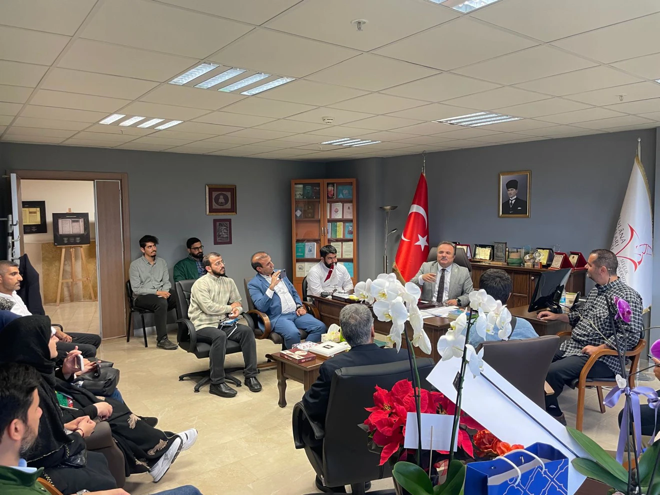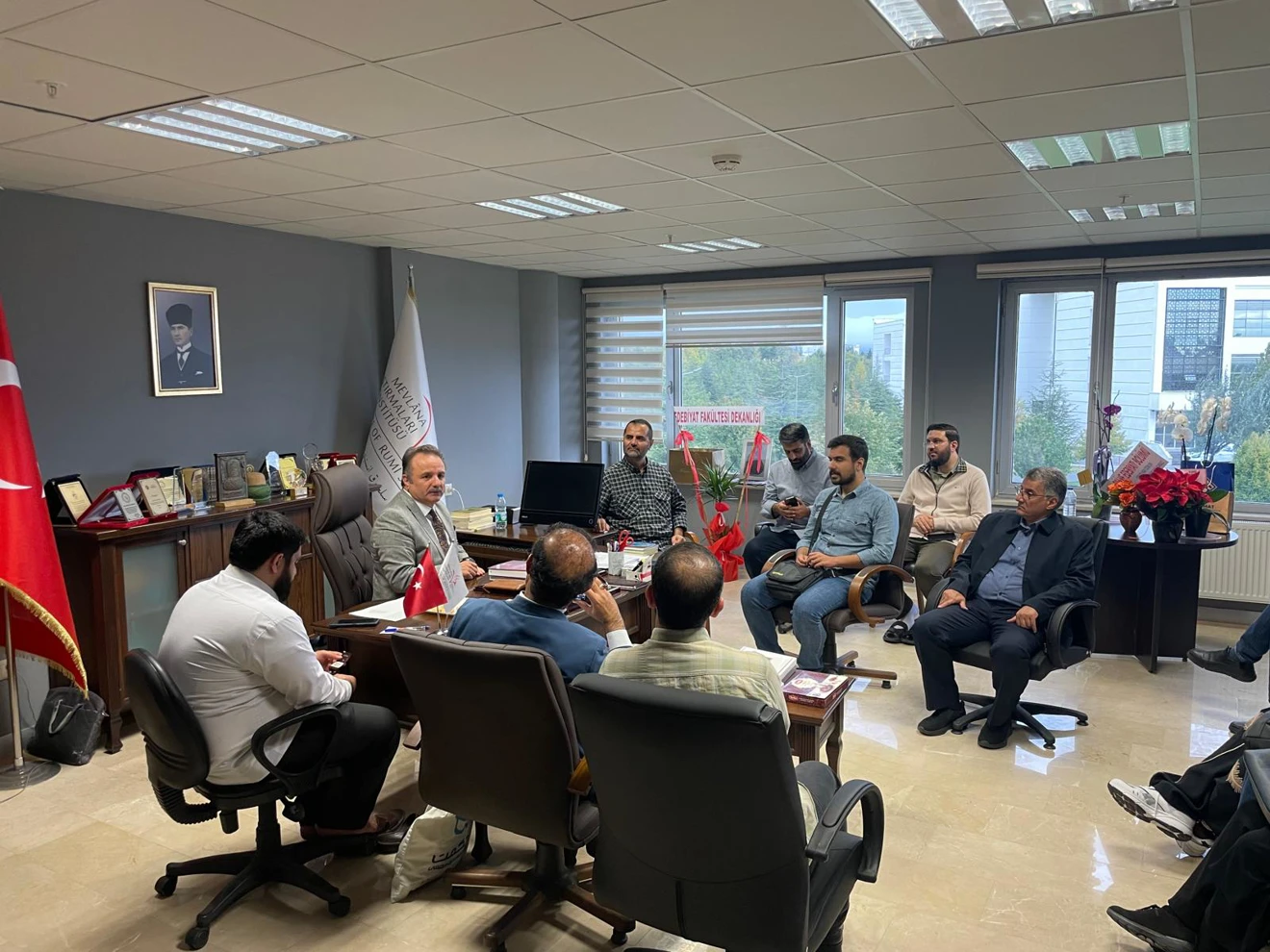 Heyete açıklamalarda bulunan Enstitü Müdürümüz Prof. Dr. Nuri ŞİMŞEKLER, Enstitüde yeni dönemde yapılacak faaliyetler ve özellikle Mevlana ve Mevlevilik Araştırmaları Ana Bilim Dalı Yüksek Lisans Programında kayıtlı öğrencilerimiz hakkında güncel bilgileri aktarmıştır. Ardından Enstitü yayınlarını inceleyen ekip, Enstitümüz Mevlana İhtisas Kütüphanesi'ni de gezerek memnuniyetlerini belirterek ayrılmışlardır.
