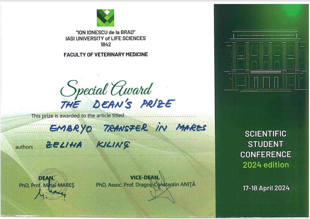 Enstitümüz Dölerme ve Suni Tohumlama Anabilim Dalı yüksek lisans öğrencimiz Zeliha KILINÇ Romanya'da düzenlenen Uluslararası öğrenci sempozyumunda özel öğrenci ödülünü almaya hak kazanmıştır. Kendisini tebrik eder, başarılarının devamını dileriz.