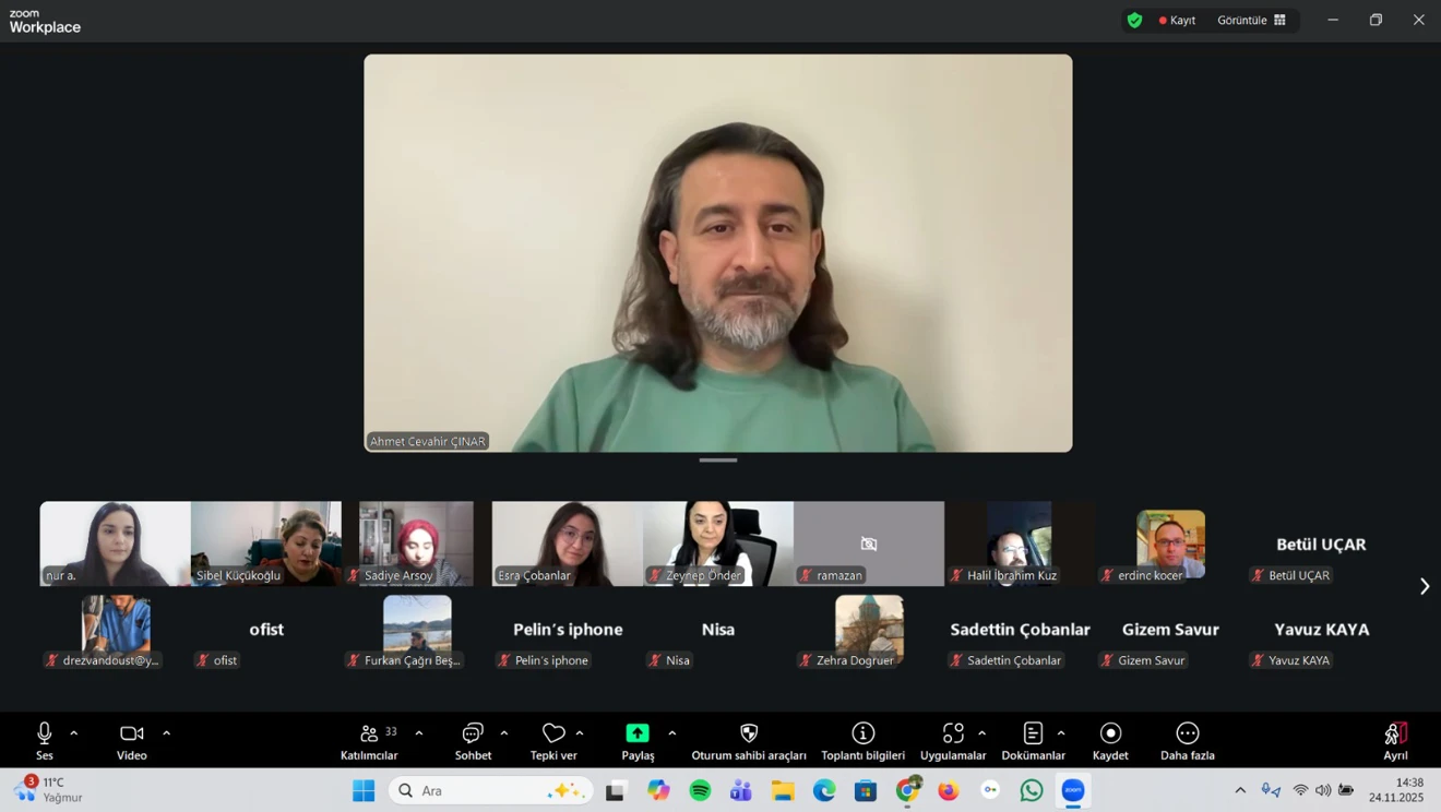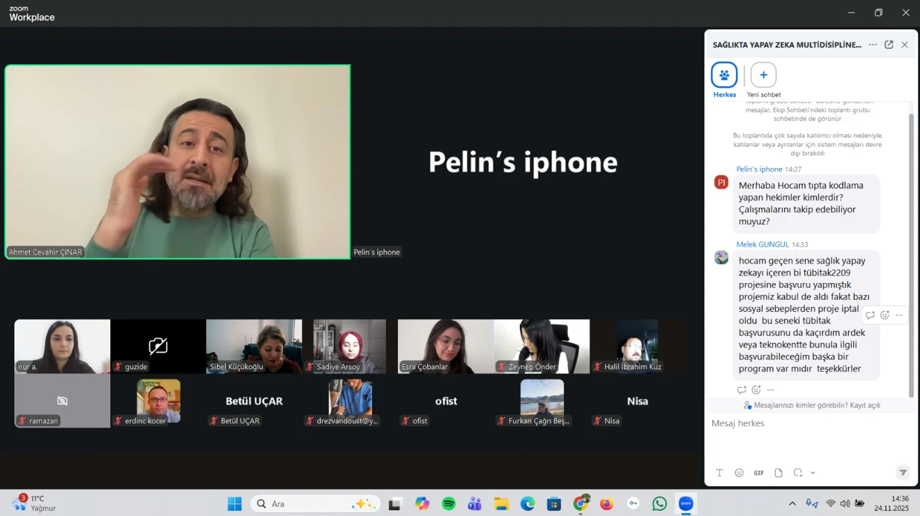 Konuşmacı Doç. Dr. Ahmet Cevahir Çınar sağlık alanında dijitalleşmenin temelini oluşturan hastane bilgi yönetim sistemlerinden günümüzde yapay zekâ tabanlı gelişmiş uygulamalara kadar uzanan dönüşümü anlattı. Çınar, son yıllarda özellikle yapay zekâ teknolojilerindeki hızlı gelişmenin sağlık hizmetlerine yeni bir boyut kazandırdığını söyledi. Çınar, yapay zekânın tıbbi görüntüleme ve hastalık teşhisi, robotik cerrahi, kişiselleştirilmiş tedavi, ilaç geliştirme, halk sağlığı analizleri ve klinik karar destek sistemleri gibi birçok alanda etkin şekilde kullanılmaya başlandığını sözlerine ekledi.