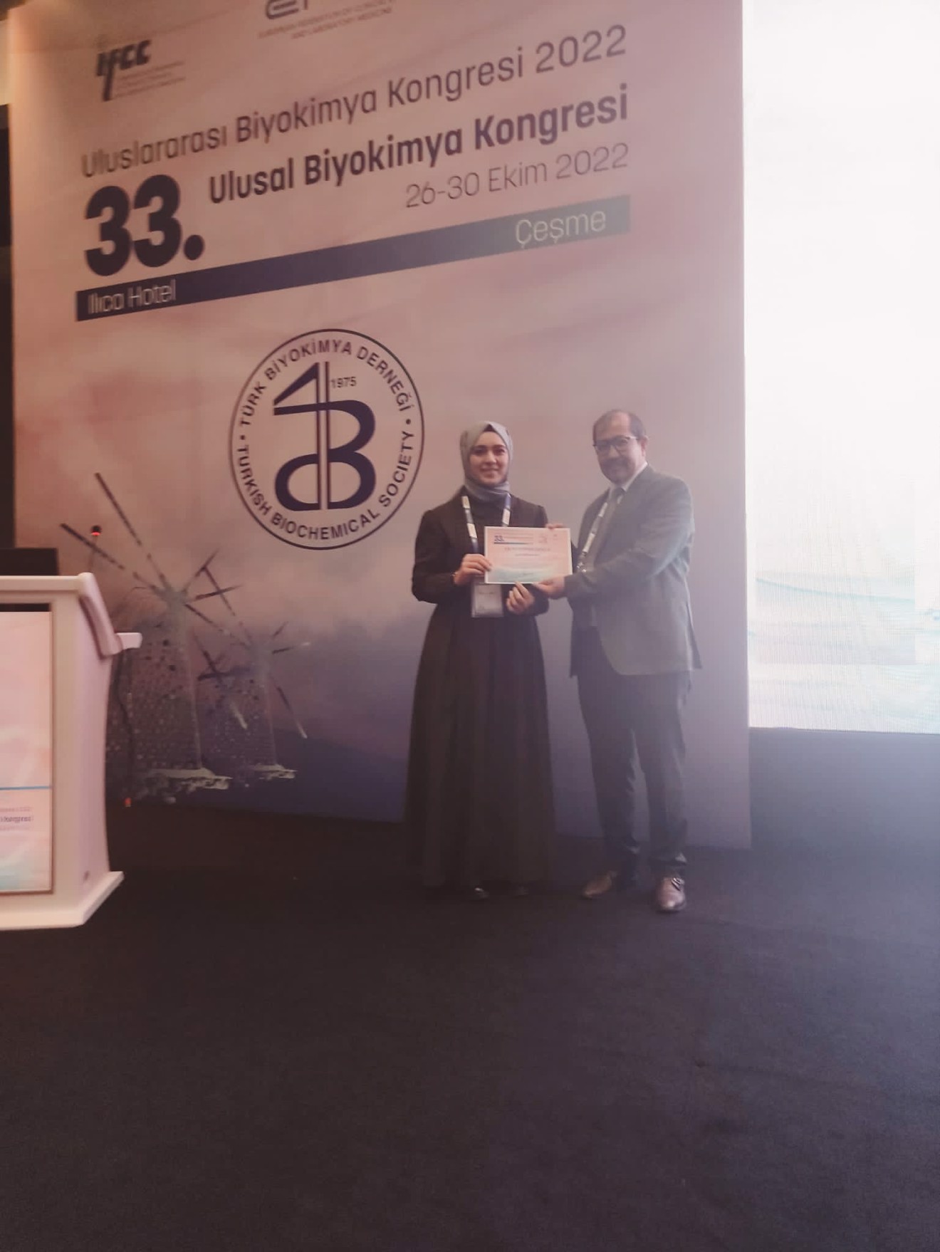 26-30 Ekim 2022 tarihleri arasında gerçekleştirilen Uluslararası/ 33. Ulusal Biyokimya Kongresi' nde Fakültemiz Tıbbi Biyokimya Anabilim Dalı öğretim üyelerimizden Prof. Dr. Hüsamettin Vatansev yürütücülüğünde gerçekleştirilen, Prof. Dr. Bahadır Öztürk, Eissa ALMAGHREBİ, Tuğba Kundakçı, Esranur Turgut, Oğuzhan Tok'un aralarında bulunduğu, Fakültemiz Tıbbi Biyokimya Anabilim Dalı doktora öğrencimiz Fatma AKAT'ın, "Asimetrik Dimetil Arginin ve Metabolit Seviyelerinin LC-MS/ MS Yöntemi İle Referans Aralıklarının Belirlenmesi" başlıklı poster çalışması en iyi poster ödülü olarak değerlendirilmiştir.