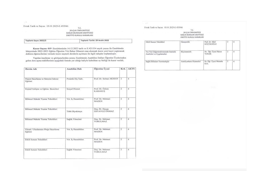 - Institute Board Decision dated 29.12.2022 and numbered 2/19