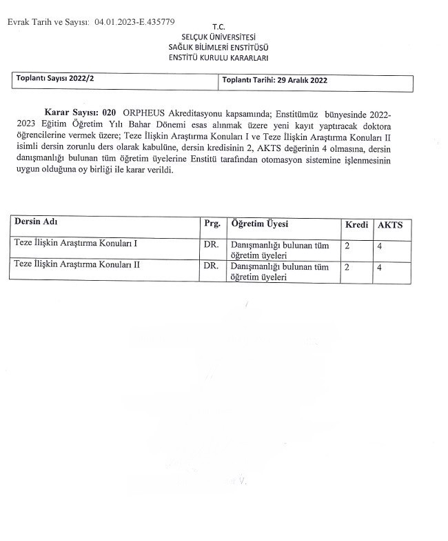 - Institute Board Decision dated 29.12.2022 and numbered 2/20