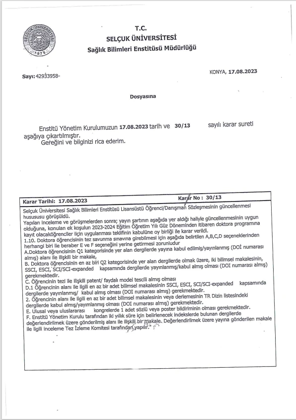 - Institute Board Decision dated 17.08.2023 and numbered 30/13