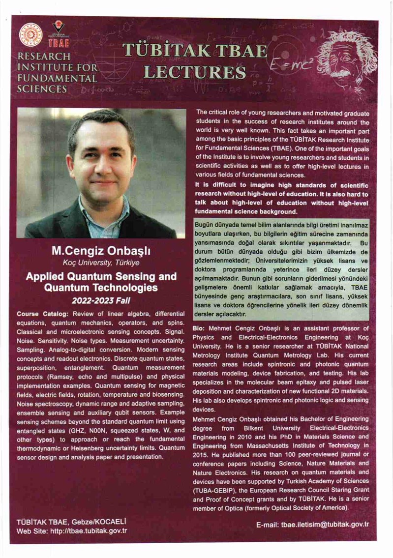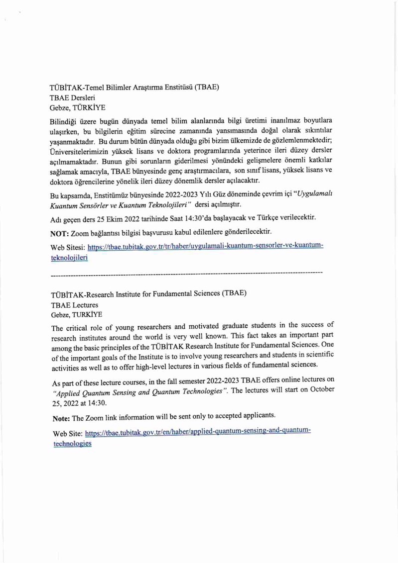 TÜBİTAK tarafından düzenlenecek olan "Uygulamalı Kuantum Sensörler ve Kuantum Teknolojileri" konulu dersler hakkında bilgi ekte yer almaktadır.