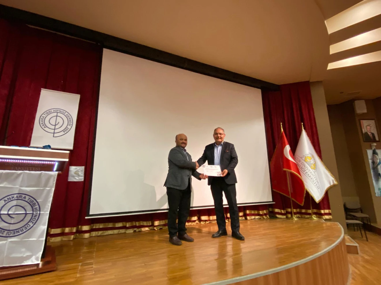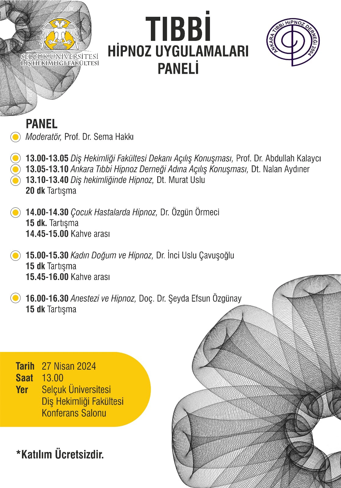 Ankara Tıbbi Hipnoz Derneği ile 26 - 27 Nisan 2024 tarihlerinde ortaklaşa düzenlediğimiz hipnoz programı, 26 Nisan 2024 Cuma günü öğleden sonra ve 27 Nisan 2024 Cumartesi günü 09.00 - 12.00 arasında iki oturumda sınırlı sayıda katılımcıya olmak üzere dernek başkanı Diş Hekimi Murat Uslu tarafından verilen uygulamalı eğitim şeklinde, 27 Nisan 2024 Cumartesi 13.00 - 17.00 arasında da daha geniş katılımlı panel şeklinde gerçekleştirilmiştir. Panel konuşmacıları ve konuları ise şu şekilde olmuştur : 1- Diş Hekimi Murat USLU (Ankara Tıbbi Hipnoz Derneği başkanı) "Diş Hekimliğinde Hipnoz 2- Uzm. Dr. Özgün ÖRMECİ (Çocuk Sağlığı ve Hastalıkları Uzmanı) "Çocuk Hastalarda Hipnoz" 3- Uzm. Dr. İnci Uslu ÇAVUŞOĞLU (Kadın Hastalıkları ve Doğum Uzmanı) "Kadın Doğum ve Hipnoz"