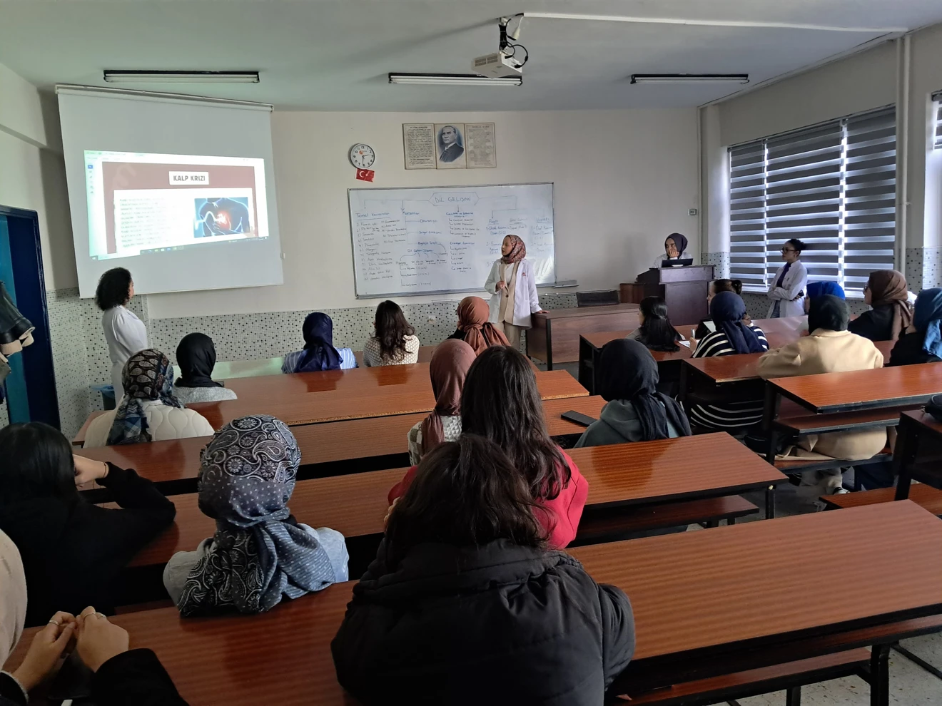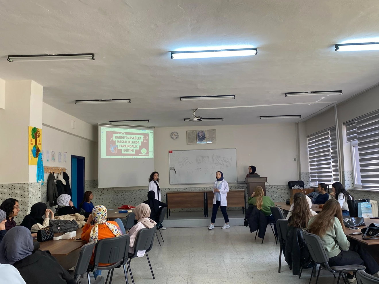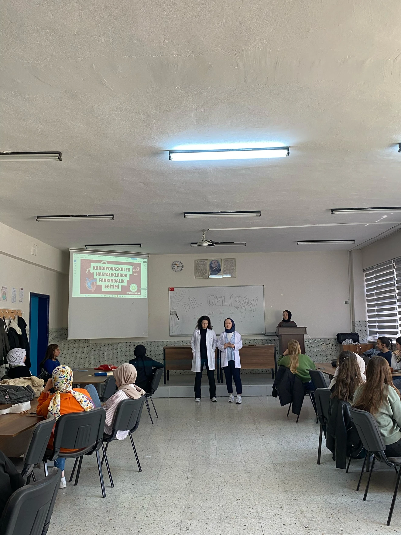 Hemşirelik Fakültesinden öğrenim gören 4. sınıf öğrencileri İlköğretim Matematik Öğretmenliği ve Sınıf Öğretmenliği 1. Sınıf öğrencilerimize Kardiyovasküler rahatsızlıklar hakkında sunum yaptılar.