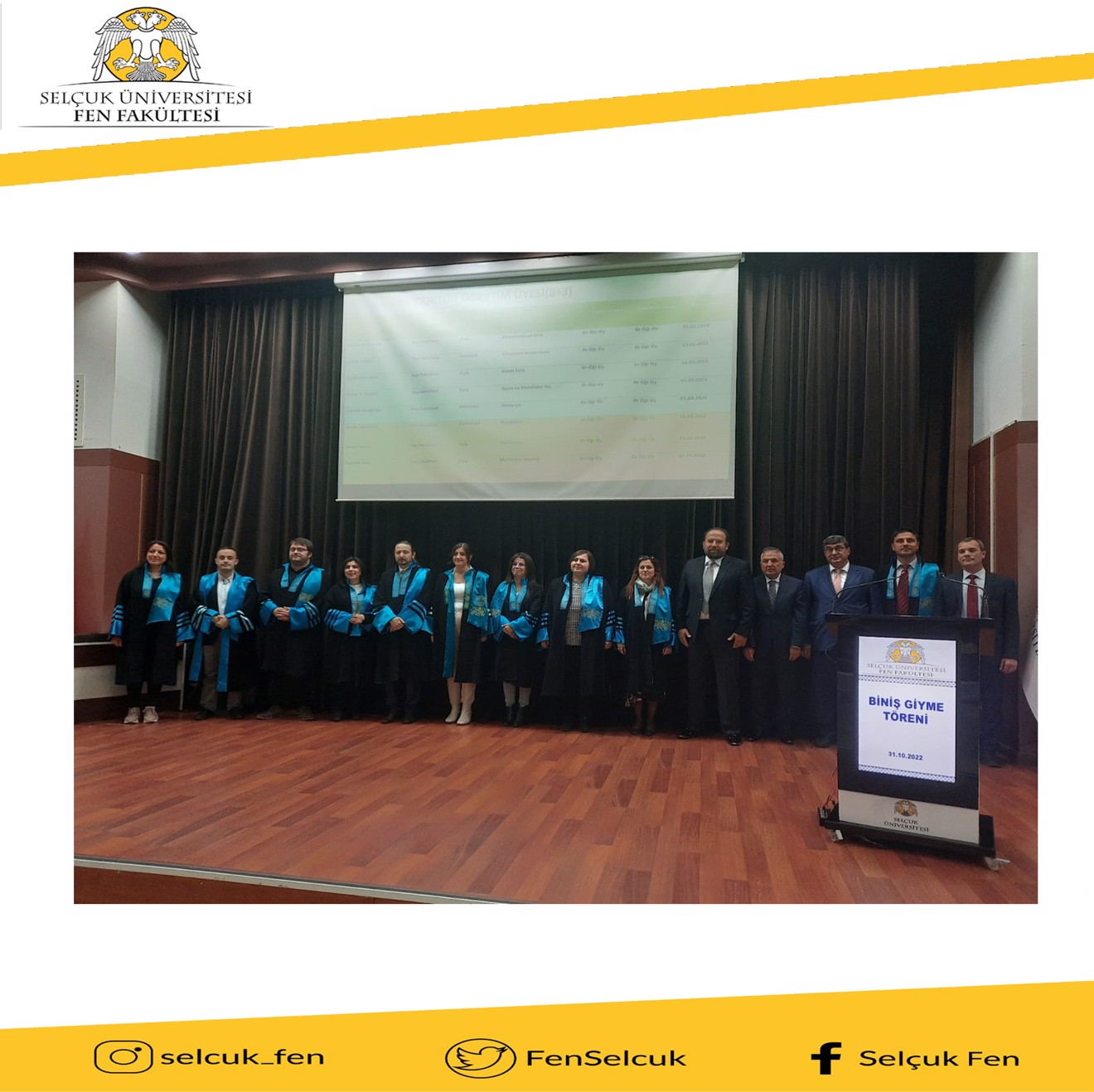 Fakültemiz 2022-2023 Akademik kurulu, 2021 başarı ödülleri ve 2020-2022 yılı öğretim üyesi kadrolarına atanan hocalarımız için biniş giyme töreni Rektör Prof.Dr. Metin AKSOY, Rektör yardımcısı Prof.Dr. Ahmet Tuğrul POLAT, genel sekreter Prof.Dr. Kamil BEŞOLUK'un katılımlarıyla büyük bir heyecanla gerçekleşti.
