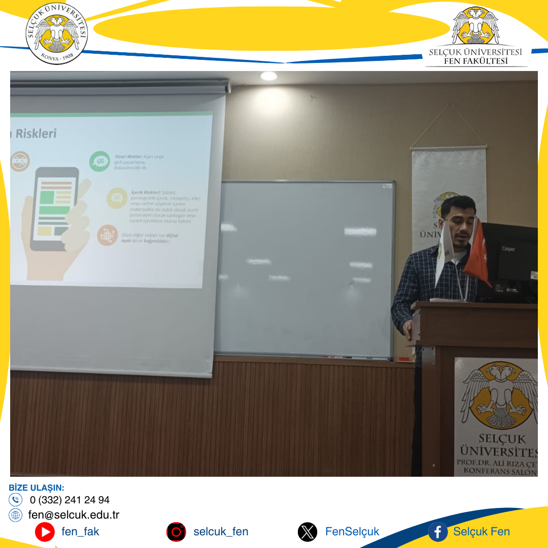 Selçuk Üniversitesi Fen Fakültesi’nde, 20 Aralık 2024’te Selçuklu İlçe Sağlık Müdürlüğü iş birliğiyle “Organ Bağışı, Davranışsal Bağımlılıklar ve Kadına Yönelik Şiddet” konulu bilgilendirme eğitimi gerçekleştirildi.