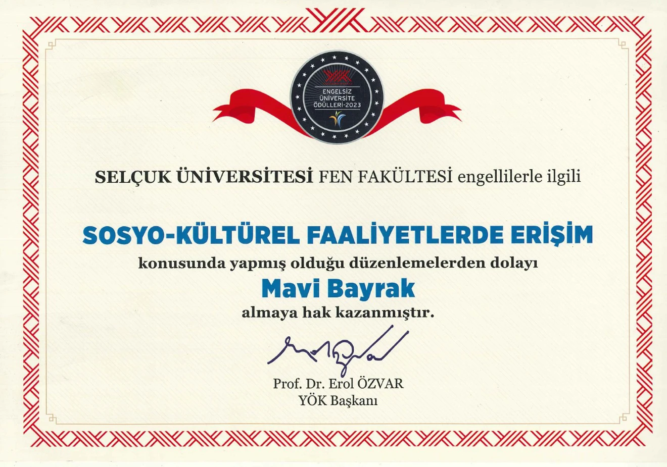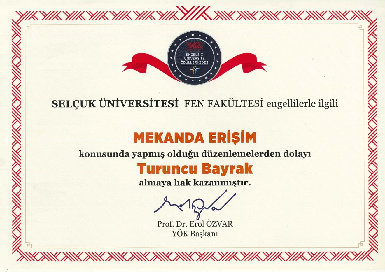 Fakültemiz, 2023 yılında Yükseköğretim Kurulu’nun "Engelsiz-Erişilebilir Üniversite" temalı çalışmasında, "Mekanda Erişim", "Eğitimde Erişim" ve "Sosyo-Kültürel Faaliyetlerde Erişim" alanlarında gösterdiği başarılı performansla bayrak beratları almaya hak kazanmıştır. Bu başarı, fakültemizin her bireyin eğitim ve sosyal hayata eşit şekilde katılımını sağlamaya yönelik kararlılığını bir kez daha ortaya koymuştur. Fakültemiz, erişilebilirliği her alanda daha da ileri taşımak için çalışmalarını sürdürmeye devam etmektedir.