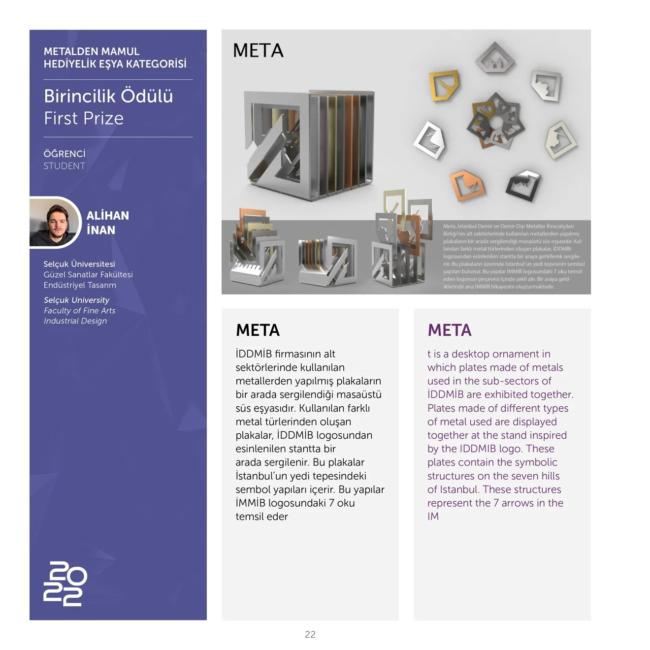Türkiye İhracatçılar Meclisi (TİM), T.C. Ticaret Bakanlığı desteği ile İstanbul Maden ve Metaller İhracatçı Birlikleri’ nin geleneksel olarak düzenlediği İMMİB 2022 Endüstriyel Tasarım Yarışması Ödül Töreni Ülkemizde yaşanan deprem felaketi nedeniyle gecikmeli olarak 23 Ağustos 2023 de Yapıldı. Katma değeri yüksek ürünlerin geliştirilmesi, endüstriyel tasarım etkinliklerinin yaygınlaştırılması ve özendirilmesi, ihracata yönelik rekabet gücünün arttırılması amacıyla 2 ayrı temada düzenlenen yarışmada öğrenci kategorisinde toplam 8 ödül verildi. Bu ödüllerden 7 sini Selçuk Üniversitesi Güzel Sanatlar Fakültesi Endüstriyel Tasarım Bölümü öğrencilerimiz aldı.
