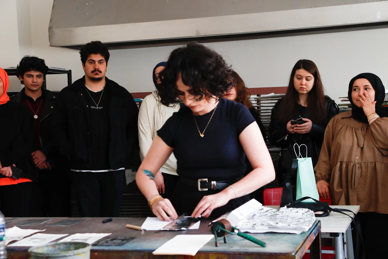 "Kitchen Lithography" başlığı altında düzenlenen etkinlikte Sevgi Sancar, mutfakta bulunan basit malzemelerle litografi baskı tekniğinin nasıl uygulanabileceğini öğrencilere uygulamalı olarak anlattı. Workshop sonrasında katılımcılar, Sevgi Sancar’ın gösterimiyle öğrendikleri teknikleri kullanarak, mevcut malzemelerle kendi baskı çalışmalarını gerçekleştirdiler.