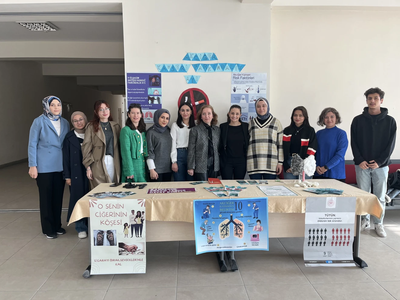 Akciğer Kanseri Farkındalık etkinlikleri kapsamında İç Hastalıkları Hemşireliği ABD'den Dr. Öğr. Üyesi Ülkü Saygılı Düzova moderatörlüğünde onkoloji hemşireliği dersi öğrencileri tarafından bir stant düzenlendi. Etkinlikte sigaranın akciğer kanseri üzerindeki zararları ve sigara bırakmanın önemi vurgulandı. Genç yaşta sigarayı bırakmanın kanser riskini büyük ölçüde azalttığına dikkat çekilerek, sigara bırakma sürecinde destek gruplarının ve profesyonel yardımın katkıları anlatıldı. Erken teşhisin hayat kurtarıcı olduğu ve düzenli sağlık kontrollerinin akciğer sağlığında kritik öneme sahip olduğu da aktarıldı. Bilgilendirici broşürlerin dağıtıldığı etkinlik, sigaranın zararları konusunda farkındalığı artırmak ve genç sağlık profesyonellerini toplumda örnek olmaya teşvik etmek amacı taşıyordu.