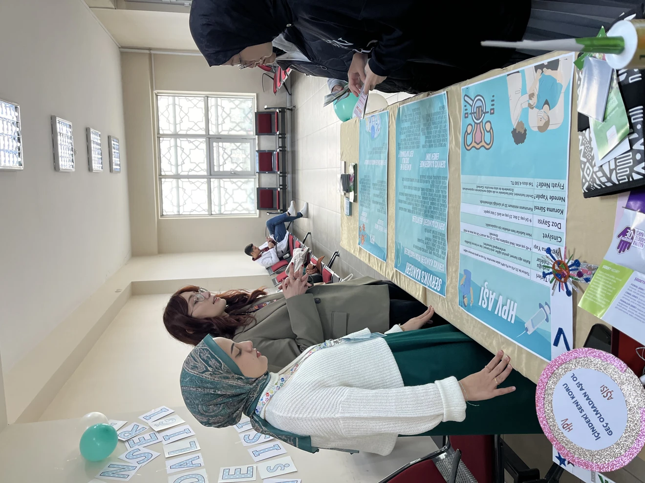 Hemşirelik Fakültesi'nde, HPV ve Serviks Kanseri Farkındalık etkinlikleri kapsamında İç Hastalıkları Hemşireliği ABD'den Dr. Öğr. Üyesi Ülkü Saygılı Düzova moderatörlüğünde onkoloji hemşireliği dersi öğrencileri tarafından bir stant düzenlendi. Etkinlikte Serviks kanseri için HPV risk faktörü vurgulandı ve HPV aşısının öneminin altı çizildi. Erken teşhisin hayat kurtarıcı olduğu ve düzenli sağlık kontrollerinin kritik öneme sahip olduğu da aktarıldı. Bilgilendirici broşürlerin dağıtıldığı etkinlik, farkındalığı artırmak ve genç sağlık profesyonellerini toplumda örnek olmaya teşvik etmek amacı ile yapıldı.