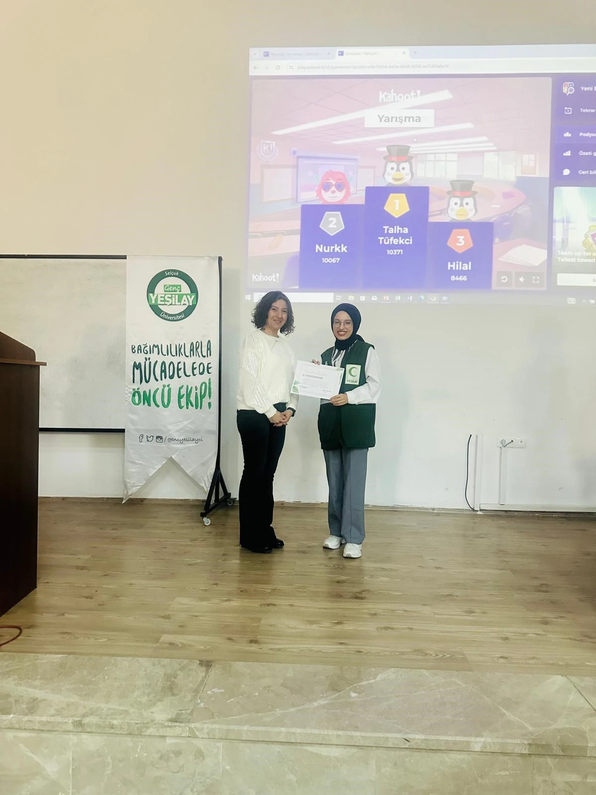 Programda Selçuk Üniversitesi Genç Yeşilay Kulübü Başkanı Sayın Sedanur KARADEMİR ve Başkan Yardımcısı Tenzile EVECE tarafından Türkiye Bağımlılıkla Mücadele hakkında farkındalık ve eğitim verildi. Yeşilay gönüllülüğü ile ilgili bilgilendirmeler yapıldı. Program sonunda konu ile ilgili kısa bilgi yarışması düzenlendi ve başarılı olan öğrencilere hediyeler verildi. Programa Fakülte dekan yardımcısı, öğretim üye ve elemanları ile öğrenciler katıldı.