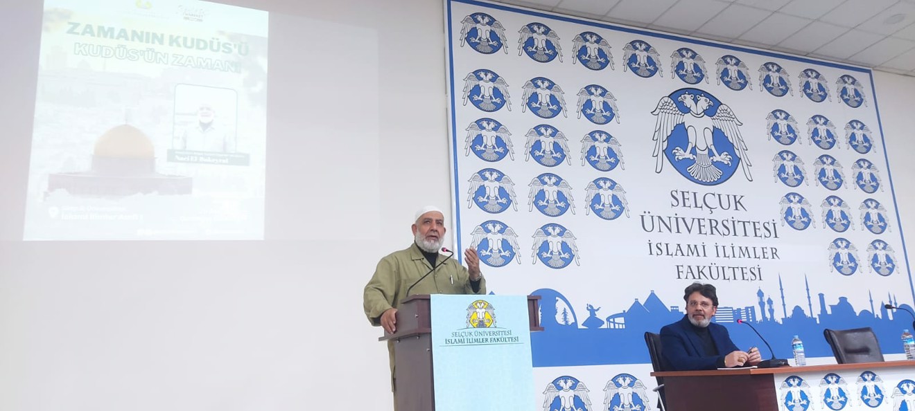 Ardından konferansa geçildi. Dr. Naci Bukeyrat, teşekkür ve dua ile başladığı konuşmasının ilk kısmında Kudüs ve Aksa'nın değerinden bahsetti. Ardından tarihten bugüne Kudüs'teki durumu kısaca özetleyen Dr. Bukeyrat, Kudüs davası konusunda müslümanlara düşen vazifeleri hatırlatarak konuşmasını sonlandırdı. Fakültemiz hocalarından Dr. Öğr. Üyesi Yusuf Sami Samancı konuşma boyunca tercümanlık yaptı.
