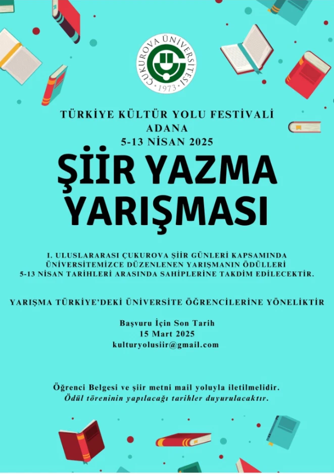 I. Uluslararası Çukurova Şiir Günleri kapsamında 05-13 Nisan 2025 tarihleri arasında Çukurova Üniversitesi tarafından düzenlenecek olan "Şiir Yazma Yarışması" ile ilgili detaylı bilgiler aşağıdaki medya dosyasında mevcuttur.