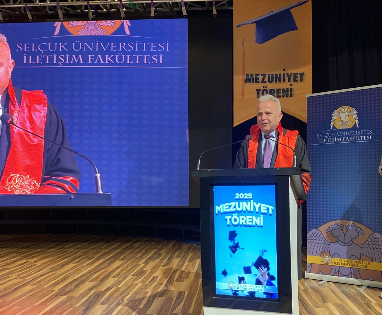 Saygı duruşu ve İstiklâl Marşı’nın okunmasıyla başlayan tören, İletişim Fakültesi Dekanı Prof. Dr. Vedat Çakır’ın açılış konuşmasıyla devam etti. Mezunlara hitaben yaptığı konuşmasında Prof. Dr. Çakır şu ifadelere yer verdi: “Bugün burada uzun bir yolculuğun son durağı, yeni başlangıçların eşiğinde bir aradayız. Sevinçliyiz, gururluyuz ve biraz da üzgünüz. Çünkü yıllar boyunca birlikte yürüdüğümüz yollar artık ayrılacaktır. Ama Selçuk İletişim ailesinin fertleri olduğunuzu da unutmayın. Sevgili mezunlar; yolunuz açık, hayalleriniz büyük, cesaretiniz daim olsun. Her ne yaparsanız yapın, insanı değerlerinizi koruyarak, vicdanlı hareket etmeyi ve iletişimin özündeki samimiyeti unutmayın. Nice başarılar sizleri bekliyor. Hepinizi yürekten kutluyorum.”
