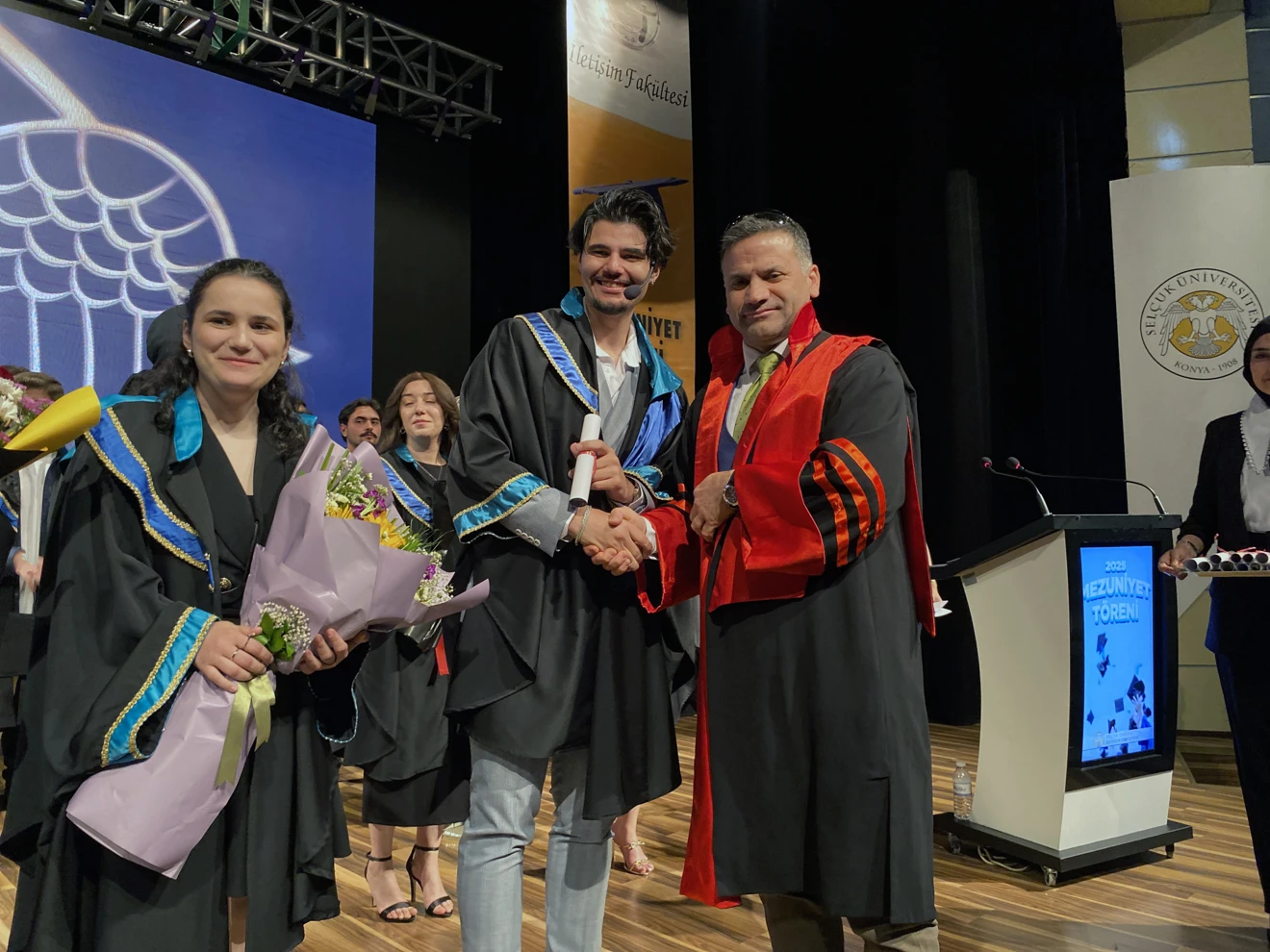 Mezuniyet töreninde fakülte dereceye giren öğrencilere diploma, plaket ve hediye verildi. Fakülte birincisi Radyo, Televizyon ve Sinema Bölümü öğrencisi Mehmet Dağlı olurken, ikinci sırada Reklamcılık Bölümünden Ahmet Gürbüz, üçüncü sırada ise Halkla İlişkiler ve Tanıtım Bölümünden Melike Keskin yer aldı. Öğrencilere ödülleri sırasıyla Fakülte Dekanı Prof. Dr. Vedat Çakır, İletişim Başkanlığı Konya Bölge Müdürü Oğuz Tunç ve Basın İlan Kurumu Konya Şube Müdürü Mehmet Feramuz Ayan tarafından takdim edildi. Mezunlar adına konuşmanı yapan Fakülte birincisi Mehmet Dağlı, mezuniyet kütüğüne isminin yer aldığı plakayı çaktı.