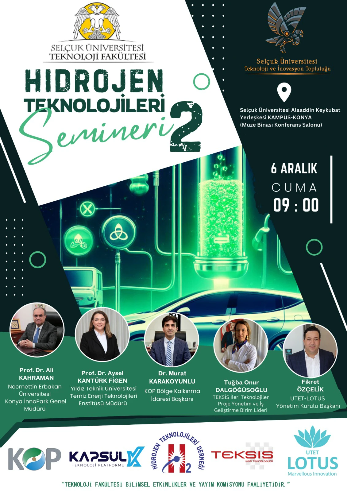Açılış konuşmasını Teknoloji fakültesi dekanı sayın Prof. Dr. Hasan Erdinç KOÇER’in gerçekleştirdiği seminer; Konya Ovası Projesi Bölge Kalkınma İdaresi Başkanı sayın Dr. Murat KARAKOYUNLU’nun “Kırsal Kalkınmanın Enerji boyutu: Kop Bölgesi çözümleri” sunumuyla devam etti. Ardından Yıldız Teknik Üniversitesi Temiz Enerji Teknolojileri Enstitüsü Müdürü sayın Prof. Dr. Aysel Kantürk Figen’in “Hidrojen Ekosistemi ve Bor Stratejileri” sunumu gerçekleşti. Öğleden sonraki oturumda ilk olarak Necmettin Erbakan Üniversitesi öğretim üyesi ve İnnopark Müdürü Prof.Dr. Ali KAHRAMAN, “Atık Isıdan Hidrojen Eldesi” sunumunu yaptı. Ardından Teksis İleri Teknolojiler Proje Yönetim Birimi Lideri sayın Tuğba Onur Dalgöğüsoğlu’nun, “Hidrojen Tesislerinde Güvenlik” başlıklı sunumu gerçekleşti. Son bölümde ise UTET-LOTUS yönetim kurulu başkanı sayın Fikret ÖZÇELİK “Hidrojen Uygulamaları” başlıklı sunumunu yaptı ve öğrencilerimizin soruları cevaplandırıldı. Kapanış konuşmasıyla seminerimiz başarılı bir şekilde sona erdi.