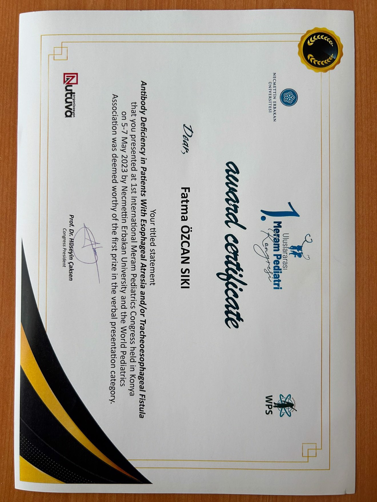Fakültemiz Çocuk Cerrahi Anabilim Dalı Öğretim Üyelerimizden Dr. Öğretim Üyesi Fatma Özcan SIKI, Çocuk Sağlığı ve Hastalıkları Öğretim Üyelerimizden Doç.Dr.İlknur KÜLHAŞ ÇELİK, Çocuk Cerrahi Anabilim Dalı Öğretim Üyelerimizden Dr. Öğretim Görevlisi Mehmet SARIKAYA, Doç.Dr.Metin GÜNDÜZ, Doç.Dr.Tamer SEKMENLİ, Prof.Dr.İlhan ÇİFTCİ, Çocuk Sağlığı ve Hastalıkları Öğretim Üyelerimizden Prof.Dr.Hasibe ARTAÇ’ın, Necmettin Erbakan Üniversitesi ve Dünya Pediatri Derneği tarafından 5-7 Mayıs 2023 tarihlerinde Konya’da düzenlenen 1. Uluslar arası Meram Pediatri Kongresi’nde sunmuş olduğu “Özofagus Atrezisi ve/veya Trakeoöz Ofageal Fistüllü Hastalarda Antikor Eksikliği” başlıklı çalışması sözlü sunum kategorisinde birincilik ödülüne layık görülmüştür.