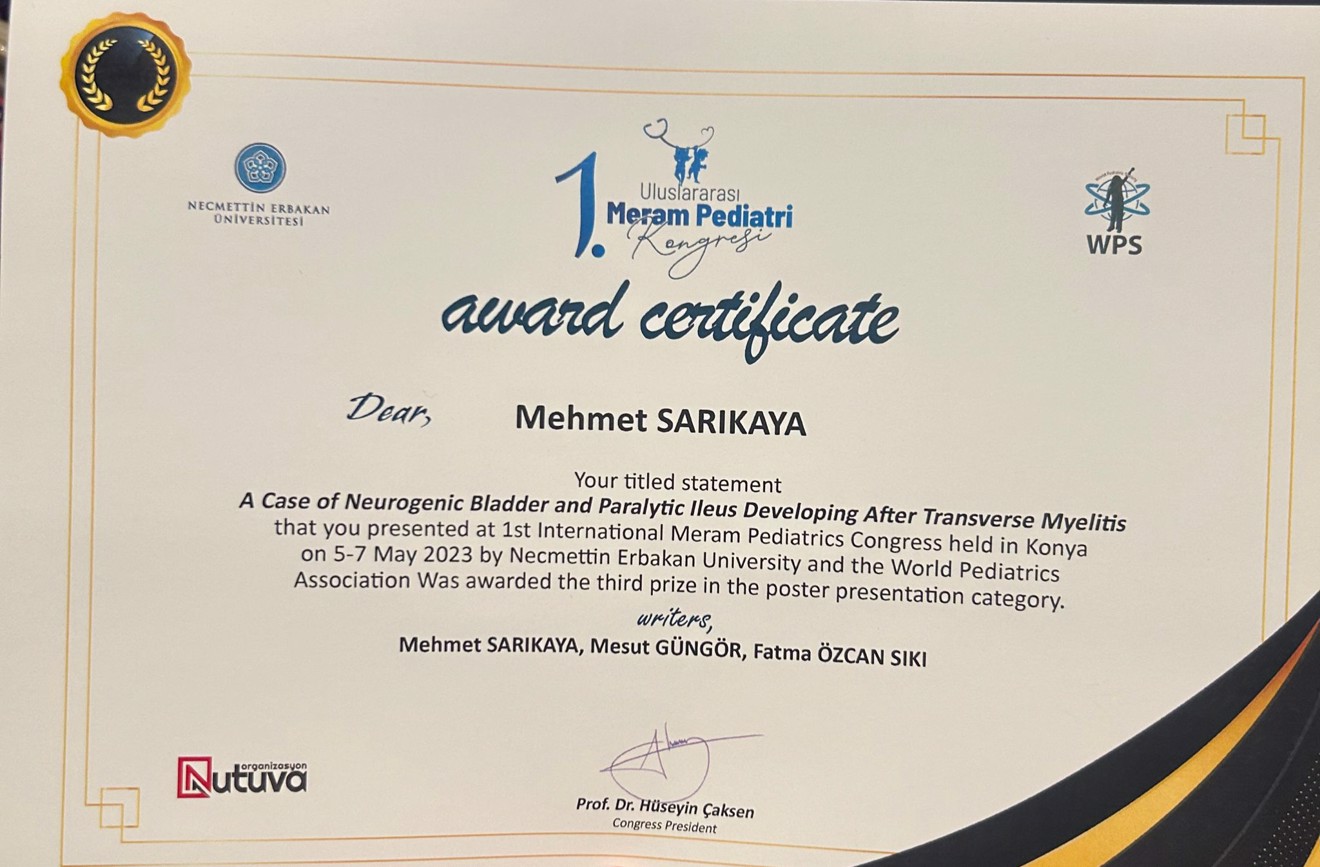 Fakültemiz Çocuk Cerrahi Anabilim Dalı Öğretim Üyelerimizden Dr. Öğretim Görevlisi Mehmet SARIKAYA, Dr. Öğretim Üyesi Fatma Özcan SIKI, Çocuk Sağlığı ve Hastalıkları Öğretim Üyelerimizden Dr. Öğretim Üyesi Mesut GÜNGÖR’ün Necmettin Erbakan Üniversitesi ve Dünya Pediatri Derneği tarafından 5-7 Mayıs 2023 tarihlerinde Konya’da düzenlenen 1. Uluslararası Meram Pediatri Kongresi’nde “Nörojenik Mesane ve Transvers Miyelit Sonrası Gelişen Paralitik İleus Olgusu” başlıklı çalışmaları poster sunum kategorisinde üçüncülüğe layık görülmüştür.