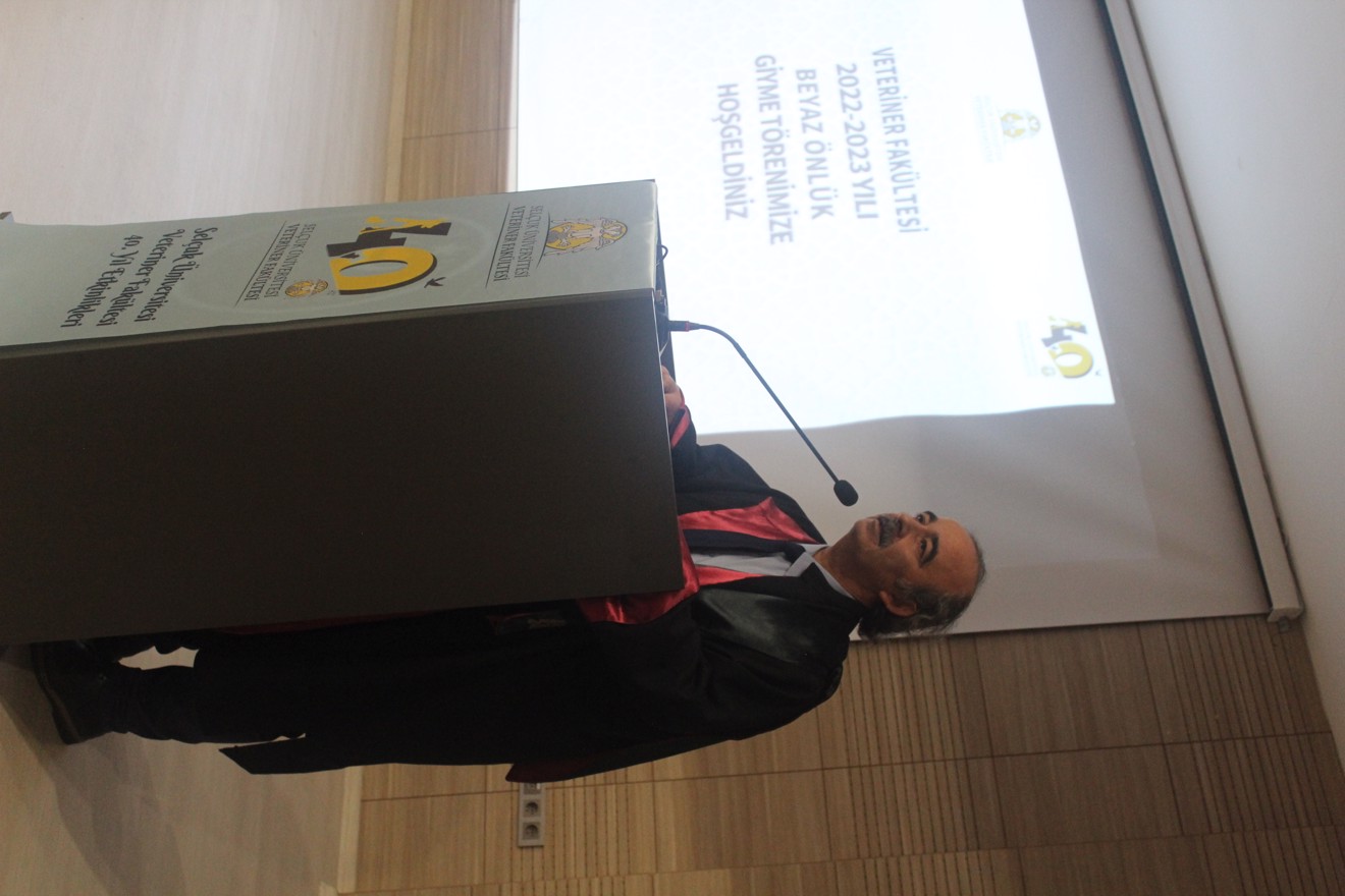 Fakültemizi yeni kazanarak veteriner hekimliğe ilk adımlarını atan birinci sınıf öğrencilerimize beyaz önlük giydirme töreni Genel Sekreterimiz Prof. Dr. Kamil Beşoluk, öğretim üyelerimiz ve velilerin katılımıyla fakültemiz Mehmet Akif Ersoy Konferans Salonumuzda gerçekleştirdi. Veteriner Hekimliği Tarihi ve Deontoloji Anabilim Dalı Başkanı Prof. Dr. Aşkın Yaşar hocamızın Veteriner Fakültesi Oryantasyon Eğitimi konulu sunumlarının ardından tüm öğrencilerimize beyaz önlükleri öğretim üyelerimiz tarafından giydirildi. Yeni meslektaş adaylarımıza aramıza hoş geldiniz der, öğrenim ve meslek hayatları boyunca başarılar dileriz.