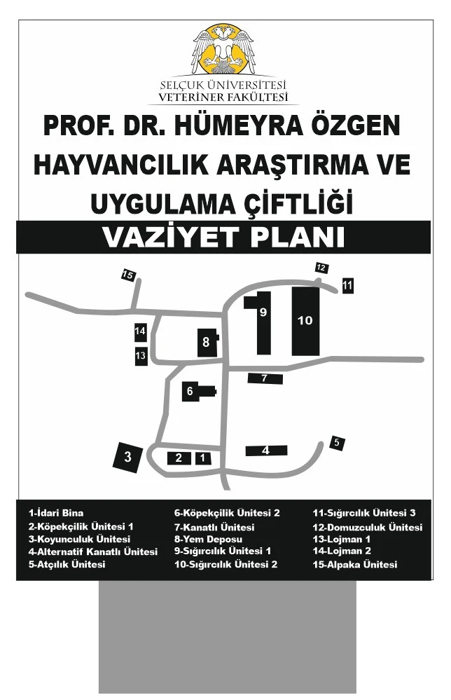 Selçuk Üniversitesi Kampüs alanı içerisinde 200.000 m2 açık arazi üzerine kurulmuş olan 4280 m2 kapalı alana sahip çiftlikte; sığır, koyun, köpek, kanatlı ve domuz yetiştiriciliği yapılmaktadır (https://goo.gl/maps/2a74pApqa262). Biyogüvenlik açısından çiftliğimizin etrafı iki metre yüksekliğinde tel örgü ile çevrilidir. Çiftliğimizde bulunan kapalı alanlara ait bilgiler aşağıdaki tabloda görülmektedir.
