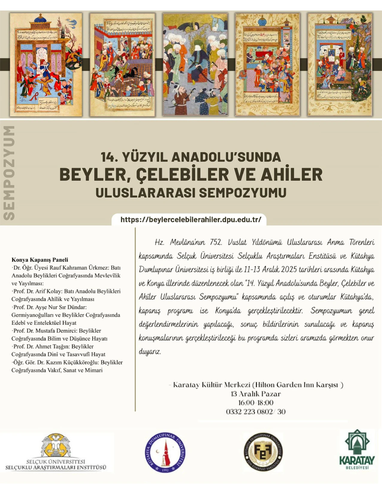 Hz. Mevlanın 752. Vuslat Yıldönümü uluslararası anma etkinlikleri kapsamında üniversitemiz Selçuklu Araştırmaları Enstitüsü ve Kütahya Dumlupınar Üniversitesi işbirliği ile 11-13 Aralık 2025 tarihleri arasında Konya ve Kütahya illerinde ''14. Yüzyıl Anadolu'sunda Beyler, Çelebiler ve Ahiler Uluslararası Sempozyumu'' gerçekleştirilecektir.