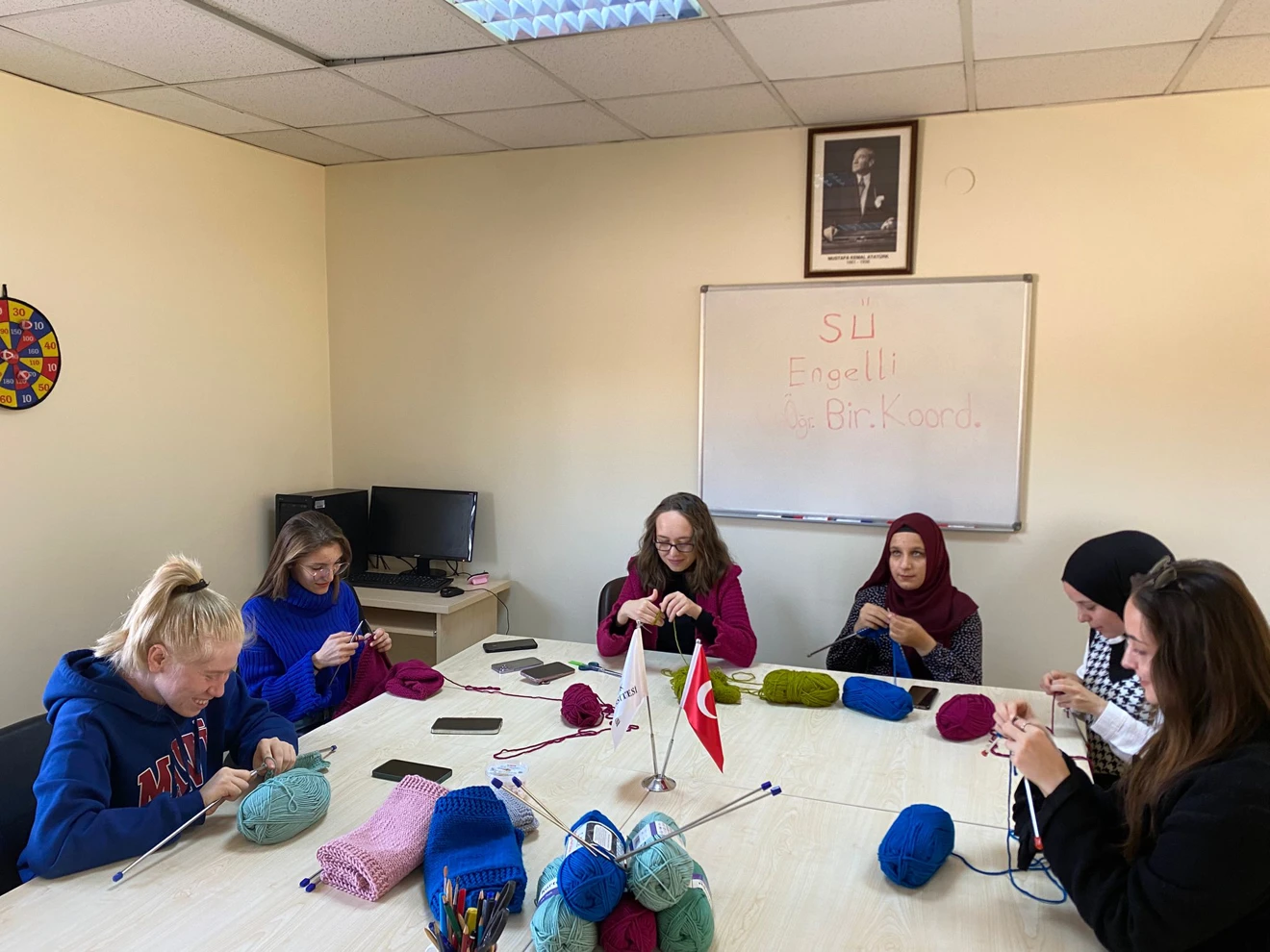 Engelli öğrencilerimizin boş zaman etkinlikleri ve doğum günü kutlaması. S.Ü. Engelli Öğrenci Birimi Koordinatörlüğümüzde çoğunluğu görme engelli öğrencilerimize personelimiz Aynur Buyukkeleş İnam tarafından bere ve atkı örme öğretiliyor. Öğrencilerimizin ördükleri ürünler 3 Aralık Dünya Engelliler gününde ilkokulların özel eğitim sınıflarında öğrenim gören otizmli öğrencilere hediye edilecektir.