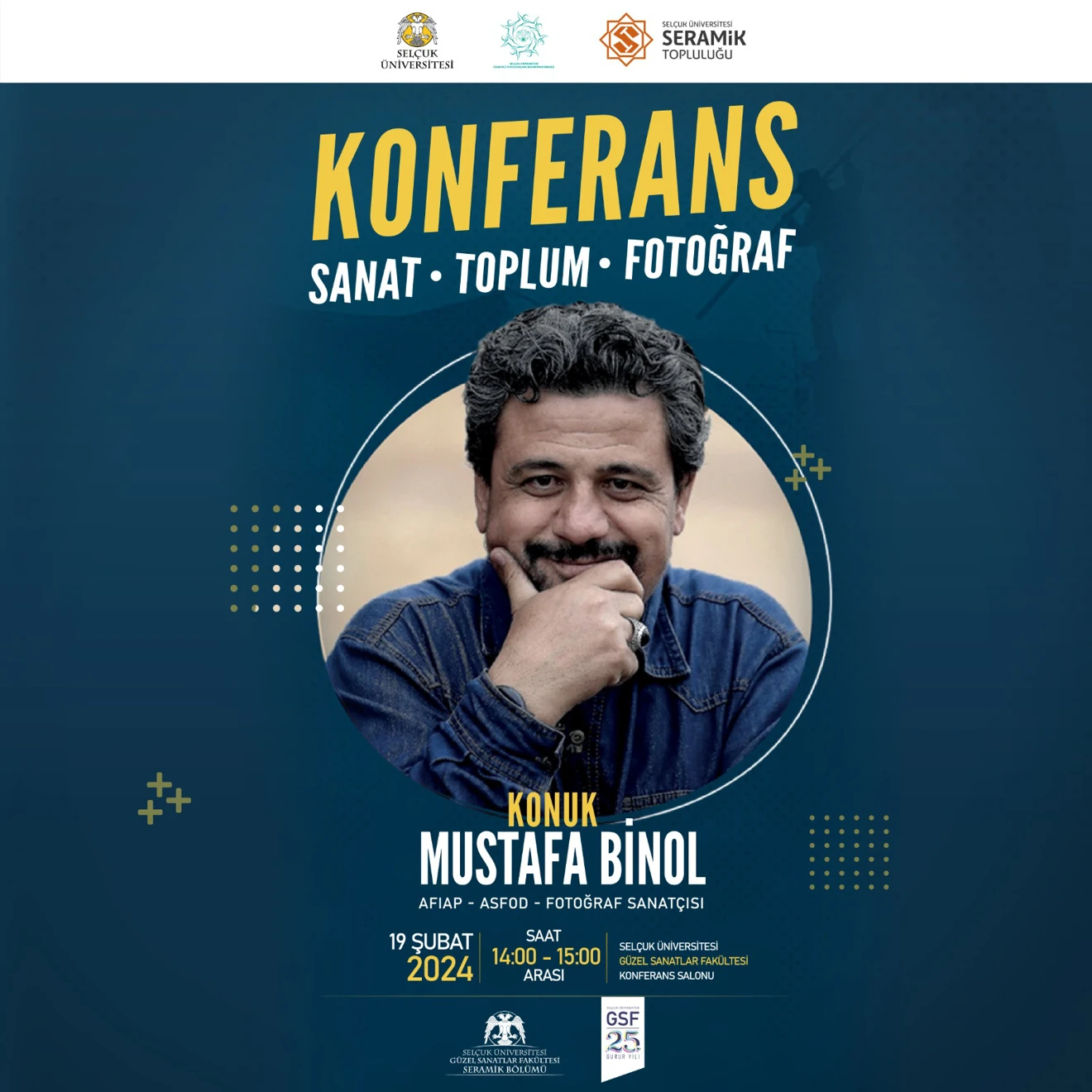 Üniversitemiz Seramik Topluluğu 19.02.2024 tarihinde Güzel Sanatlar Fakültesi konferans salonunda fotoğraf sanatçısı Mustafa Binol'ün katılımı ile "Sanat, Toplum ve Fotoğraf" konulu konferansı gerçekleştirmiştir