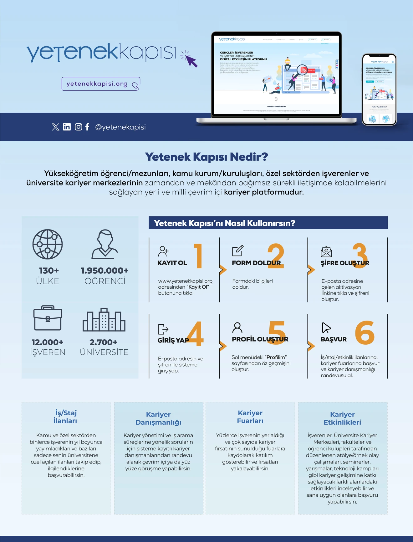 Sevgili öğrencilerimiz ve mezunlarımız; kariyer yolculuğunuzda Yetenek Kapısı size farklı fırsatlar sunuyor. Yetenek Kapısı üzerinden tek bir tık ile binlerce işverenin, öğrenci ve mezunlara yönelik iş/staj ilanlarına ve yarı zamanlı çalışma imkânlarına erişebilirsiniz.