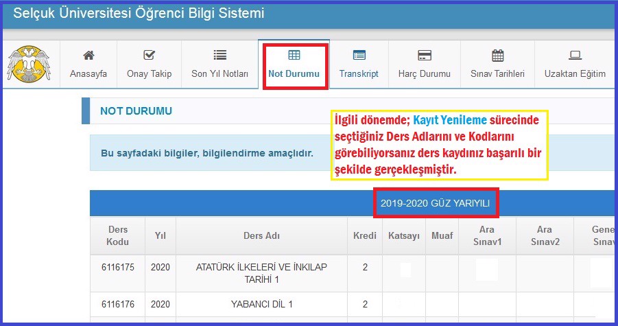 Öğrencilerimizin Kayıt Yenileme sürecinde seçtiği dersler öğrenci danışmanı sistemine online olarak düşer. Danışman ders kaydı yapan öğrencilerin seçtiği dersler uygun ise onay verir veya düzeltir. Öğrencinin seçtiği dersler danışman online onayı ile öğrenci bilgi sistemine işlenir. Bu süreçte öğrenci kesinlikle danışmanı ile iletişime geçmelidir. Onaylanan derslerini öğrenmelidir. Danışman onay süreci tamamlandıktan sonra öğrenci bilgi sistemi tarafından onaylanan dersler güncellenir ve ders kaydı kesinleşmiş olur. Öğrencinin kesinleşen dersleri; Öğrenci Giriş ( https://obis.selcuk.edu.tr/) sitemine okul numarası ve şifre ile giriş yaparak not durumu sekmesinden kontrol etmelidir. Sistemde o yarıyıl alması gerekli derslerin adını ve ders kodlarını kontrol etmelidir. (Yukarıda resimde görülmektedir) Eğer üzerinde eksik ders var veya fazla ders gözüküyor ise Ders Ekleme-Bırakma sürecinde Yüksekokula dilekçe ile başvurmalıdır. |