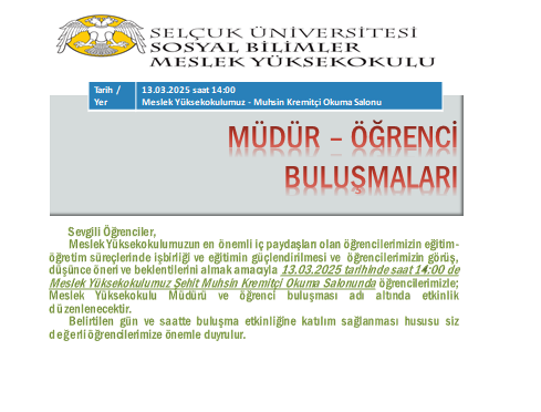 Duyurular Müdür-Öğrenci Buluşmaları Etkinliği 10 Mart 2025 Sosyal Bilimler Meslek Yüksekokulu Medya Paylaş: