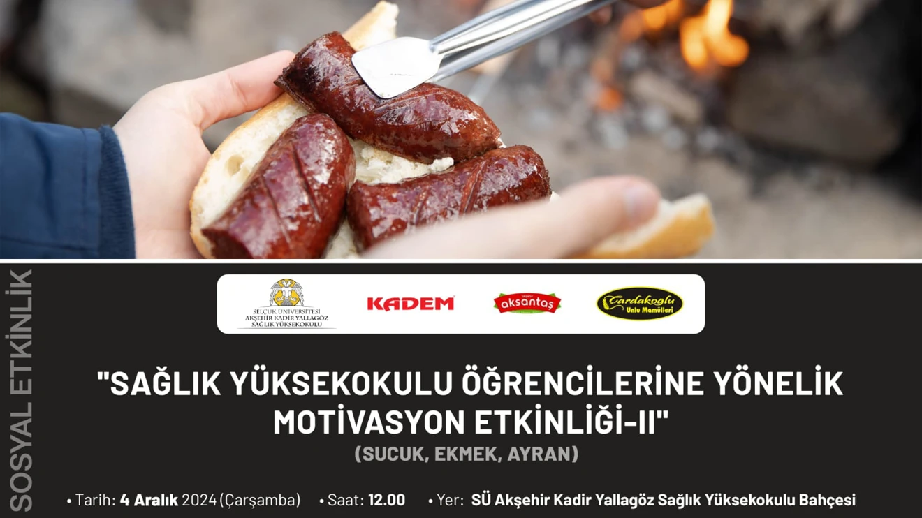 Selçuk Üniversitesi Akşehir Kadir Yallagöz Sağlık Yüksek Okulu Müdürlüğü tarafından okul öğrencilerine final sınavları öncesi motivasyon etkinliği düzenlendi. Sağlık Yüksek Okulu öğrencileri için okul bahçesinde düzenlenen etkinlikte öğrenciler sucuk ekmek yiyerek çalan müzik eşliğinde oyunlar oynayıp sınav öncesi moral depoladılar.Selçuk Üniversitesi Akşehir Kadir Yallagöz Sağlık Yüksek Okulu bahçesinde düzenlenen etkinliğe Selçuk Üniversitesi Akşehir Kadir Yallagöz Sağlık Yüksek Okulu Müdürü Prof. Dr. Uğur Arslan, Akşehir MYO Müdürü Doç. Dr. Mehmet Şahin, Sağlık Yüksek Okulu Müdür Yardımcısı Doç. Dr. Alev Yıldırım Keskin, Akşehir MYO Müdür Yardımcısı Öğr.Gör.Soykan Uysal, Kadir Yallagöz Sağlık Yüksekokul Sekreteri Özden Gülal, Akşehir MYO Öğretim Üyesi Dr.Öğr.Üyesi Kadir Öztaş, akademisyenler ve Akşehir Kadir Yallagöz Sağlık Yüksek Okulu öğrencileri katıldıÖğrencilere bahçede pişirilen ekmek arası sucuk ve ayran dağıtılırken sonrasında da çalan oyun havaları eşliğinde öğrenciler oyun oynayıp halay çektiler.