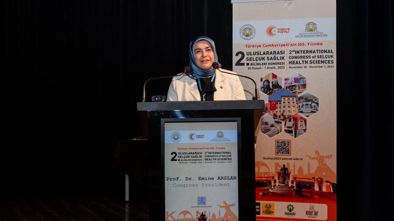 Kongre Başkanı, Selçuk Üniversitesi Sağlık Bilimleri Fakültesi Dekanı Prof. Dr. Emine Arslan, Sultan Alparslan Kültür Merkezinde gerçekleştirilen kongrenin açılışında Fakülte olarak öğrencilere bilimsel projeler, sosyal sorumluluk projeleri, insanlık yararına model tasarlama, topluma hizmet projeleri ve Fakülteye bağlı Selçuk Ecza Simülasyon Ünitesi gibi yenilikçi uygulamalarıyla keyifli ve kaliteli bir çalışma ortamı oluşturduklarını söyledi. Sağlığın biyo-psiko-sosyal bir bütünlük hali olduğunu ve bu bütünlükte tedavi çalışmaları kadar koruyucu önleyici çalışmaların da önemli yer tuttuğunu kaydeden Arslan, hizmet ve tedavilerin çok boyutlu olması gerektiğini, sağlığın sürdürülebilirliği ilkelerine değer verdiklerini aktardı.