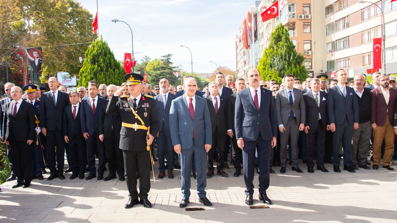 29 Ekim Cumhuriyet Bayramı dolayısıyla hazırlanan ilk tören, Anıt Alanı’nda düzenlendi. Konya Valisi Vahdettin Özkan ve Konya Büyükşehir Belediye Başkanı Uğur İbrahim Altay, Atatürk Anıtı’na çelenk sundu. “Yüz Bisiklet: Öğretmen - Öğrenci Buluşması” temalı bisiklet turunun startının verildiği törene Selçuk Üniversitesi Rektör Yardımcısı Prof. Dr. Emrullah Eken de katıldı.