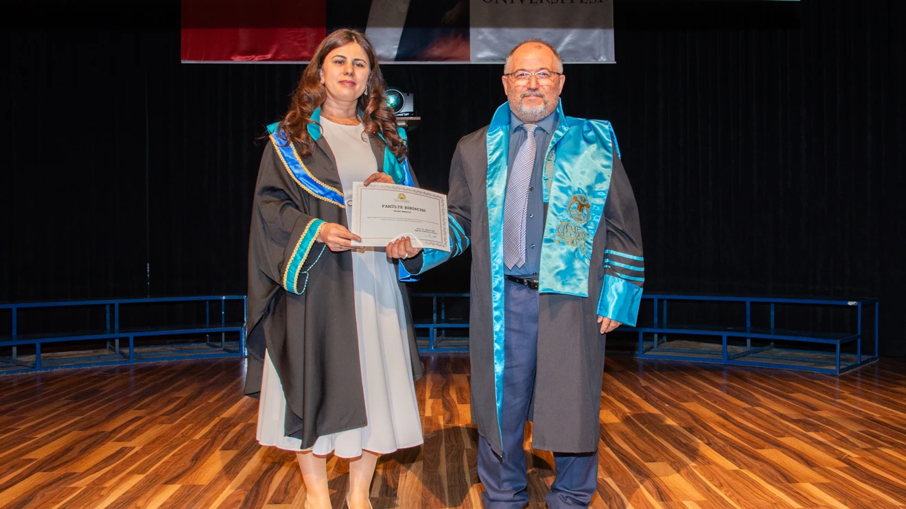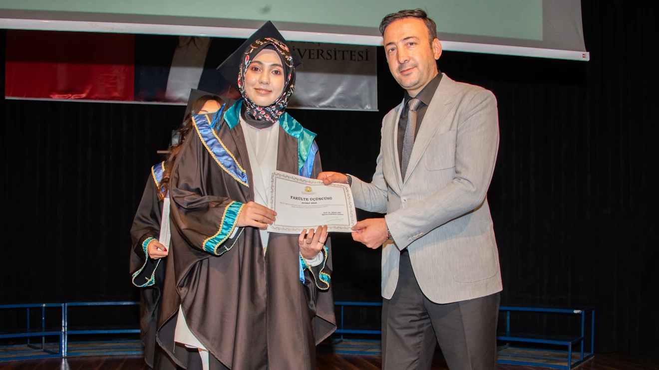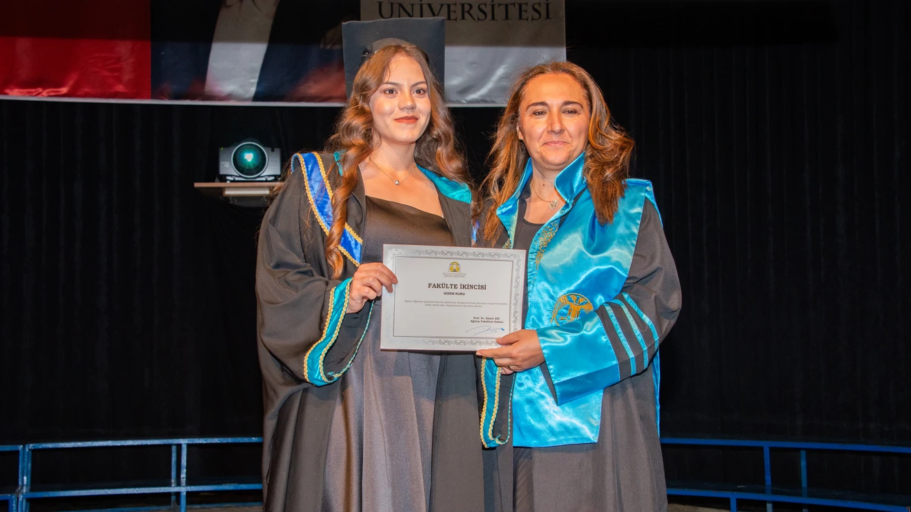 Dekan Prof. Dr. Kamil Arı tarafından Eğitim Fakültesi Türkçe Öğretmenliği Bölümünü birincilikle bitiren mezun öğrenci Dilek İnkaya’ya plaket takdim edildi.