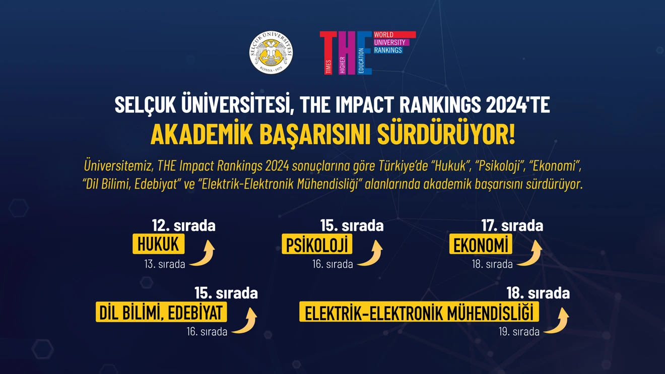 Üniversite, THE Impact Rankings 2024 sonuçlarında Türkiye’de “Hukuk”, “Psikoloji”, “Ekonomi”, “Dil Bilimi, Edebiyat” ve “Elektrik-Elektronik Mühendisliği” alanlarında akademik başarısını sürdürdü. Selçuk Üniversitesi; Hukuk’ta 12, Psikoloji’de 15, Ekonomi’de 17, Dil Bilimi, Edebiyat’ta 15, Elektrik – Elektronik Mühendisliği’nde ise 18’inci sırada yer aldı.