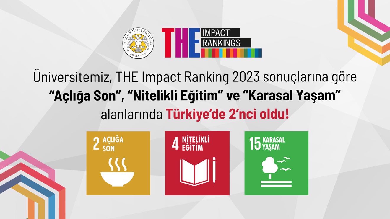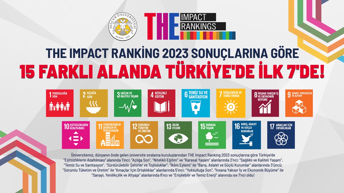 Geleceğe hazırladığı gençlerde çevre bilincinin kalıcı hale gelmesi için pek çok adım atan Selçuk Üniversitesi, dünyanın önde gelen üniversite sıralama kuruluşlarından THE Impact Ranking 2023 sonuçlarına göre “Eşitsizliklerin Azaltılması” alanında Türkiye’de 1’inci oldu. “Açlığa Son”, “Nitelikli Eğitim” ve “Karasal Yaşam” alanlarında Türkiye’de 2’nci olan Selçuk Üniversitesi; “Sağlık ve Kaliteli Yaşam”, “Temiz Su ve Sanitasyon”, “Sürdürülebilir Şehirler ve Topluluklar”, “İklim Eylemi” ile “Barış, Adalet ve Güçlü Kurumlar” alanlarında Türkiye’de 3’üncü sıraya yerleşti.