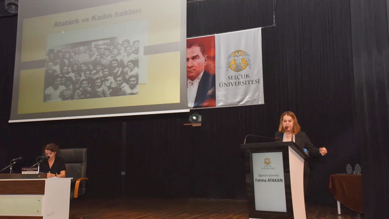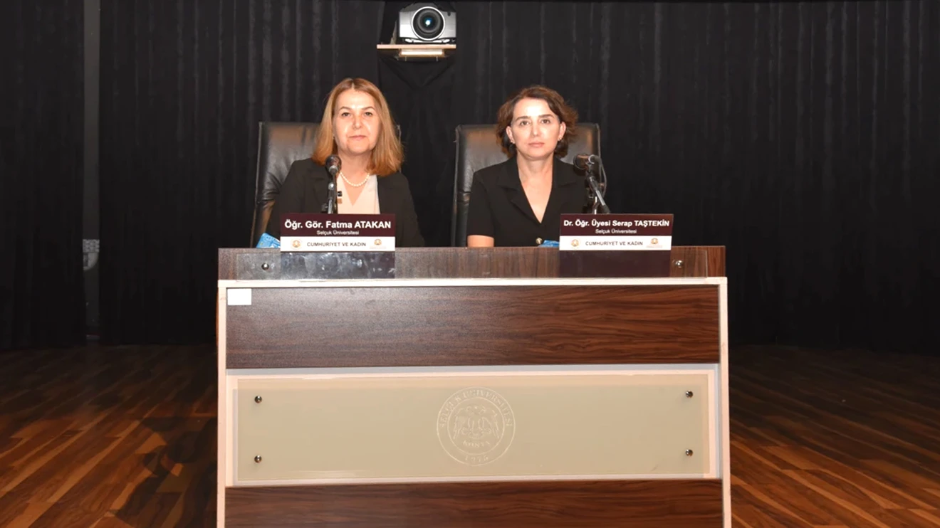 Açılış konuşmalarının ardından Selçuk Üniversitesi Atatürk İlkeleri ve İnkılap Tarihi Bölüm Başkanı Dr. Öğr. Üyesi Serap Taştekin ve Öğr. Gör. Fatma Atakan, “Cumhuriyet ve Kadın” konulu söyleşi gerçekleştirdi.