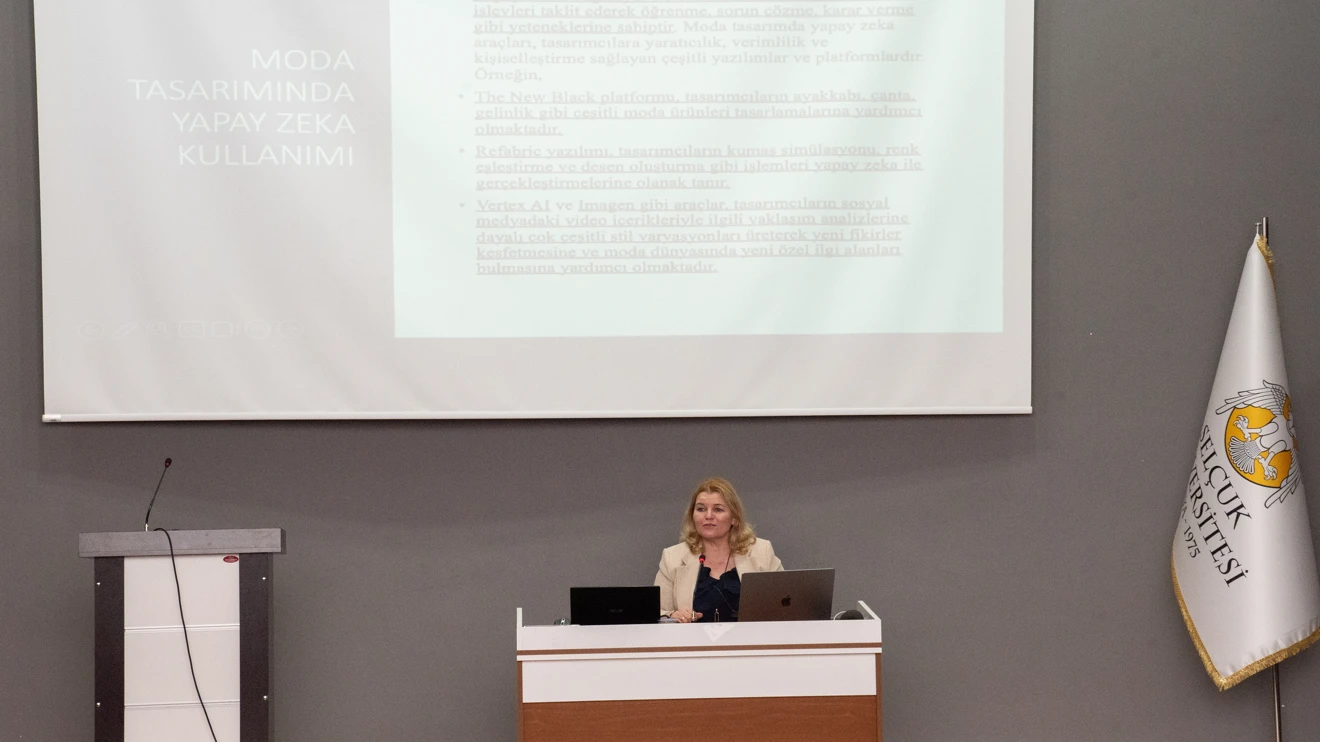 Selçuk Üniversitesi Müze Binası Konferans Salonu’nda gerçekleştirilen etkinliğe akademisyenler ve öğrenciler katıldı. "Moda Tasarımında Yapay Zekanın Yeri ve Kullanımı" adlı sunumunda yapay zekanın, bilgisayar sistemlerinin insan benzeri bilişsel işlevleri taklit ederek öğrenme, sorun çözme, karar verme gibi yeteneklerine sahip olduğunu belirten Moda Tasarımı Bölümü Dr. Öğr. Üyesi Ayşegül Paralı, “Moda tasarımda yapay zeka araçları, tasarımcılara yaratıcılık, verimlilik ve kişiselleştirme sağlayan çeşitli yazılımlar ve platformlardır.” dedi.