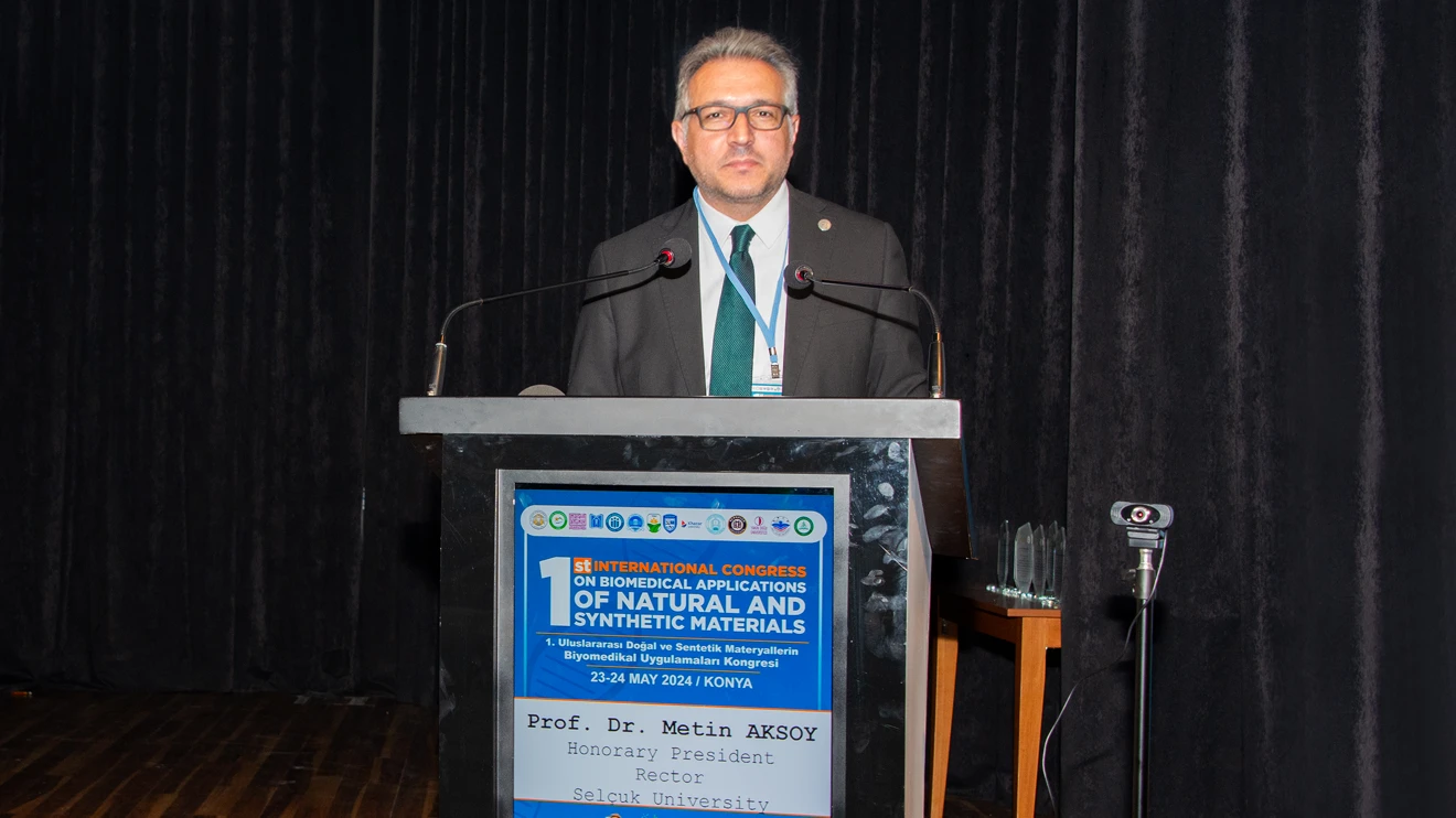 Selçuk Üniversitesi olarak prestijli bir etkinliğe ev sahipliği yapmaktan büyük onur ve mutluluk duyduğunu ifade eden Rektör Prof. Dr. Metin Aksoy, “Bildiğiniz üzere sağlıklı bir yaşamın temelinde yatan en önemli unsurlardan biri, tıbbi teknolojinin gelişmesidir. Bu gelişmede ise biyomedikal uygulamalar, insan sağlığına doğrudan etki eden hayati öneme sahip bir alandır. Zira doğal ve sentetik materyallerin bu alandaki kullanımı, hastalıkların teşhisinden tedavisine kadar geniş bir yelpazede kritik rol oynuyor. Bu bağlamda araştırma ve geliştirme faaliyetlerinin desteklenmesi, multidisipliner yaklaşımların benimsenmesi ve yenilikçi çözümler üretilmesi elzemdir. Bilimsel araştırmaların desteklenmesi ve yaygınlaştırılması konusunda her zaman öncü rol üstlenen Üniversitemiz, bu tür uluslararası kongreler düzenlemeye ve ev sahipliği yapmaya büyük önem veriyor. Özellikle bilimsel araştırma projelerinde son birkaç yılda ortaya koyduğumuz araştırmalarda Üniversitemizin aday araştırma statüsünü yeniden kazanmasını hep birlikte sağladık. Bu kapsamda bilimsel araştırma projelerde göreve geldiğimiz ilk yıl 30 milyon, geçen sene 50 milyon, bu sene 80 milyona yakın uluslararası kongreler ile iş birlikleri dahil olmak üzere akademisyenlerimizin ve öğrencilerimizin projelerine destek verdik. Üniversitemiz misyonunun bir parçası olan bu kongrenin, bu alana önemli bir katkı sağlayacağına ve geleceğe yönelik yeni iş birliklerine zemin hazırlayacağına inanıyoruz. Kongremiz kapsamında dünya genelinden gelen bilim insanları ve araştırmacılar, doğal ve sentetik materyallerin biyomedikal uygulamalarındaki son gelişmeleri sunacak, bilgi ve deneyimlerini paylaşacaklardır. Dahası, bu kongre; farklı disiplinlerden gelen araştırmacıları bir araya getirerek iş birliği yapmalarını ve yeni fikirler geliştirmelerini sağlayacak, bu alandaki ilerlemelerin hızlanmasına ve daha etkili çözümler üretilmesine olanak tanıyacaktır. Kongrenin düzenlenmesinde emeği geçen tüm organizasyon komitesine, meslektaşlarıma ve Üniversitemiz paydaşlarına teşekkür ediyorum. Ayrıca bu etkinlikte yer alarak bilgi ve deneyimlerini bizlerle paylaşacak olan kıymetli konuşmacılara ve katılımcılara da şükranlarımı sunuyorum.” ifadelerini kullandı.